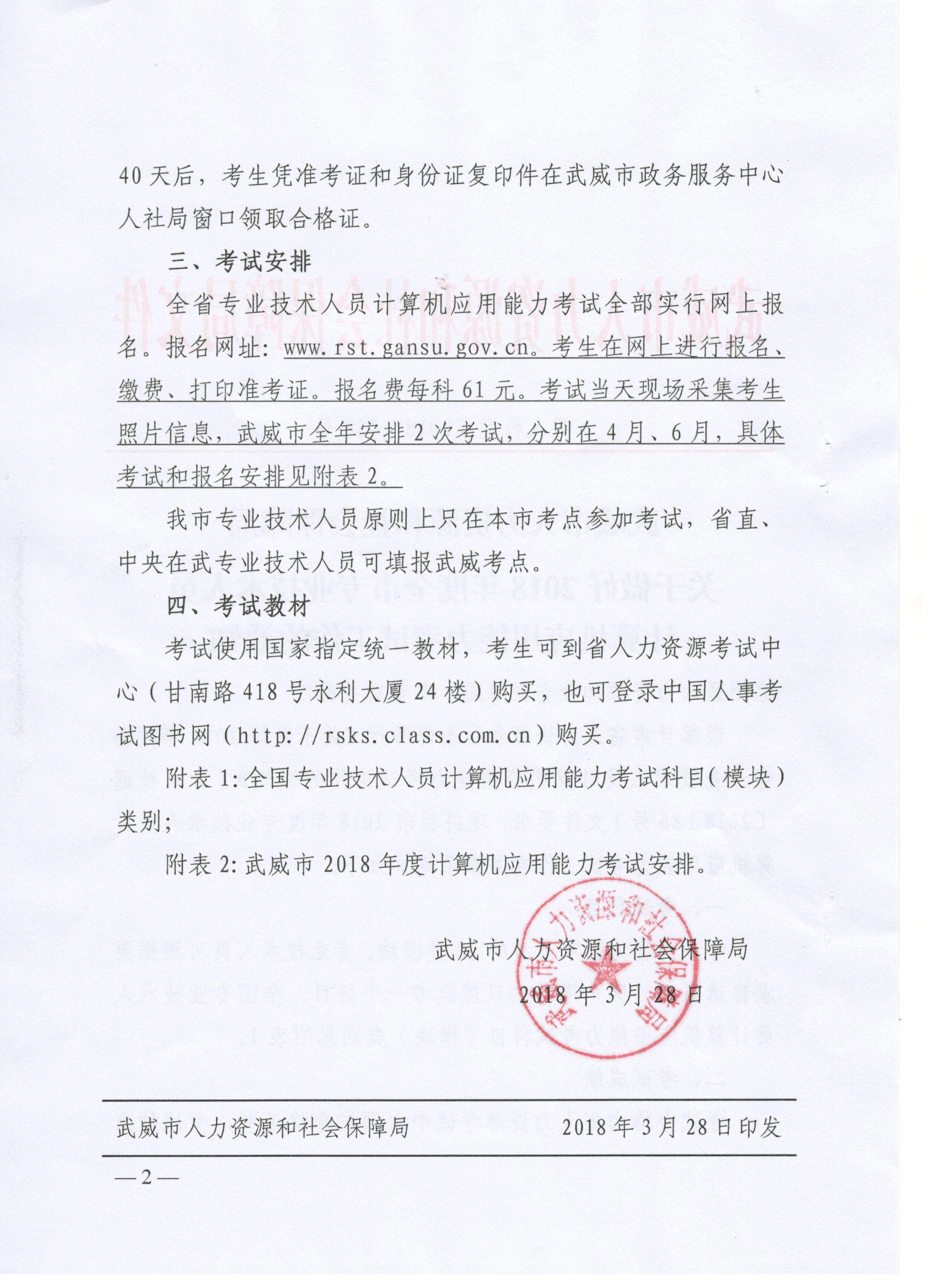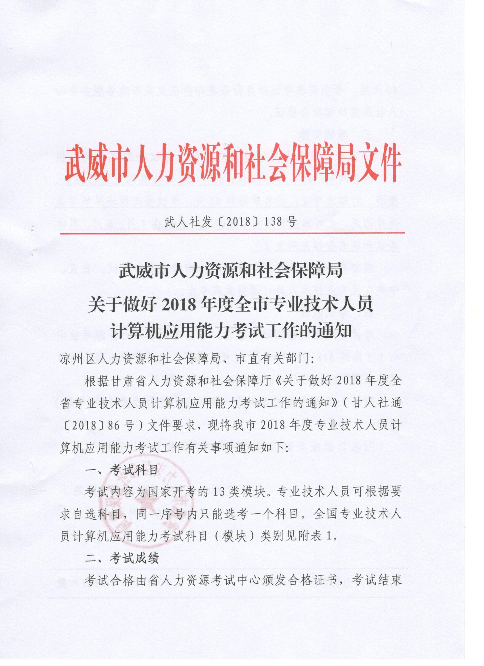 <轉(zhuǎn)>武威市人力資源和社會保障局關(guān)于做好2018年度全市專業(yè)技術(shù)人員計(jì)算機(jī)應(yīng)用能力考試工作的通知(武人社發(fā)〔2018〕138號 )