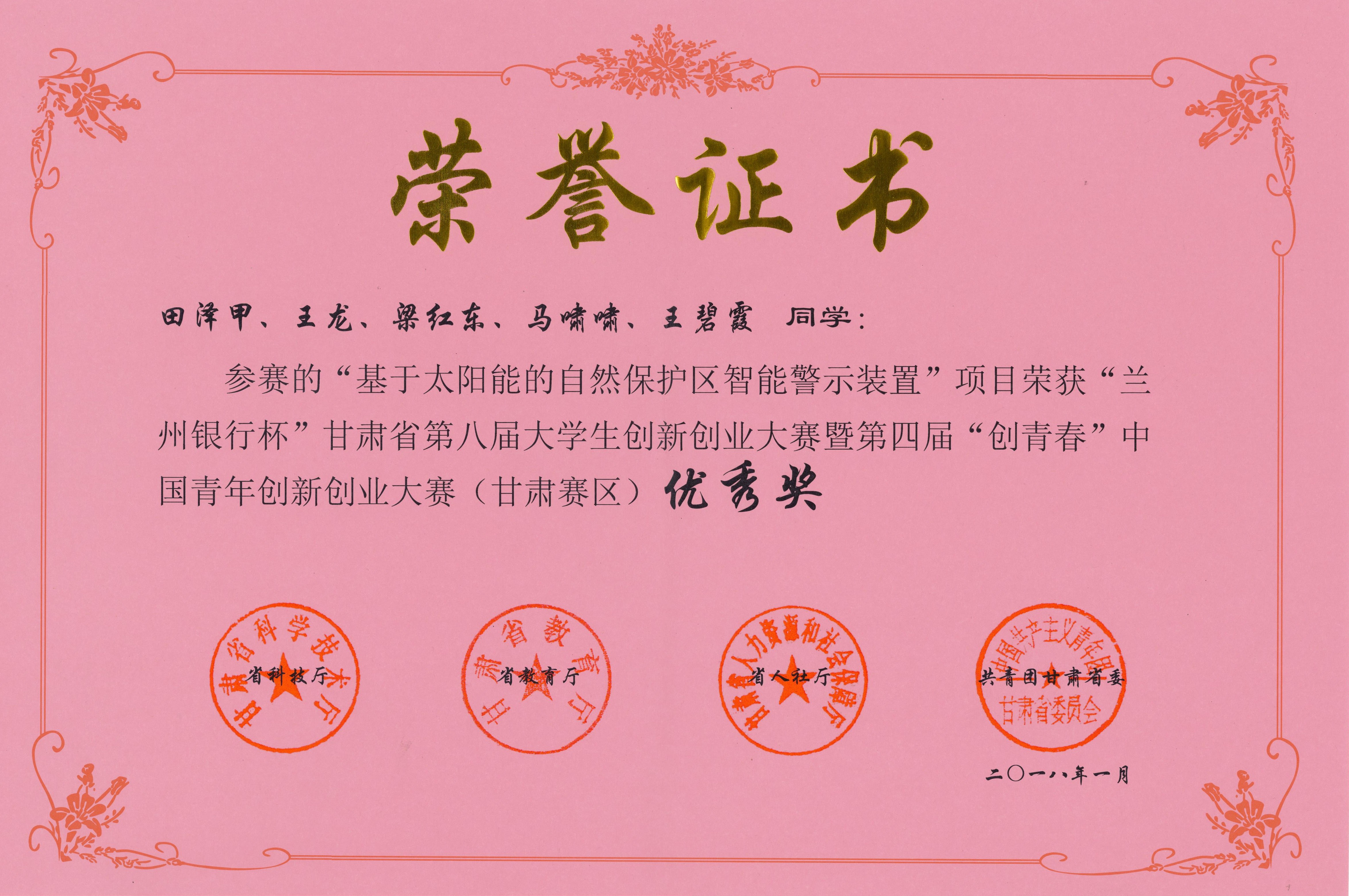 近日,從省教育廳、省科技廳、省人力資源和社會保障廳、共青團(tuán)甘肅省委聯(lián)合下發(fā)的《關(guān)于公布“蘭州銀行杯”甘肅省第八屆大學(xué)生創(chuàng)新創(chuàng)業(yè)大賽暨第四屆“創(chuàng)青春”中國青年創(chuàng)新創(chuàng)業(yè)大賽(甘肅賽區(qū))獲獎名單的通知》中獲知,在今年1月7日舉辦的“蘭州銀行杯”甘肅省第八屆大學(xué)生創(chuàng)新創(chuàng)業(yè)大賽暨第四屆“創(chuàng)青春”中國青年創(chuàng)新創(chuàng)業(yè)大賽(甘肅賽區(qū))中,我院選送的“基于太陽能的自然保護(hù)區(qū)智能警示裝置”項目獲得優(yōu)秀獎。