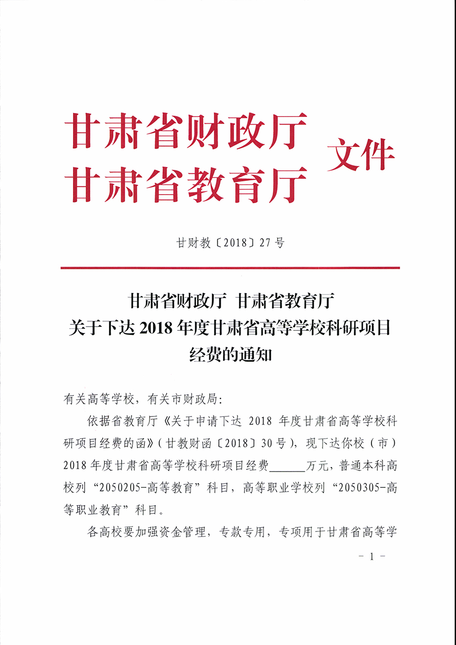 轉(zhuǎn)發(fā)甘肅省財(cái)政廳 甘肅省教育廳關(guān)于下達(dá)2018年度甘肅省高等學(xué)校科研項(xiàng)目經(jīng)費(fèi)的通知