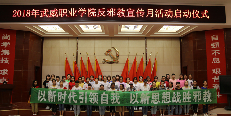 根據(jù)省教育廳印發(fā)的“2018年全省教育系統(tǒng)反邪教宣傳月宣傳周宣傳日活動(dòng)方案”要求,學(xué)院集中開展以“抵制邪教、和諧校園”為主題的反邪教宣傳教育活動(dòng)。6月14日,學(xué)院舉行了“武威職業(yè)學(xué)院2018年反邪教宣傳月活動(dòng)啟動(dòng)儀式”及師生簽名活動(dòng),師生代表共220余人參加了啟動(dòng)儀式,啟動(dòng)儀式由宣傳統(tǒng)戰(zhàn)部部長(zhǎng)王繼林主持。