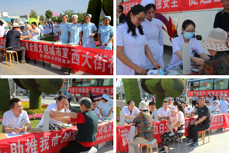 為保障臨床用血安全,給我市創(chuàng)建全國文明城市活動(dòng)增亮添彩,由武威市衛(wèi)生計(jì)生委、武威市紅十字會主辦,武威市中心血站承辦的“世界無償獻(xiàn)血者日”大型宣傳、義診、獻(xiàn)血活動(dòng)于6月14日在武威市文化廣場隆重舉行。學(xué)院附屬醫(yī)院醫(yī)護(hù)人員、學(xué)院紅十字志愿者方隊(duì)、無償獻(xiàn)血獲獎(jiǎng)?wù)叻疥?duì)等30余家單位的干部群眾參加了活動(dòng)。