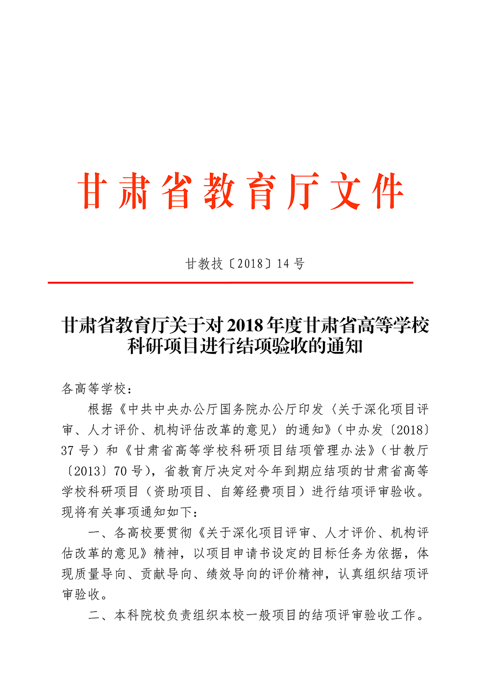 轉發(fā)甘肅省教育廳關于對2018年度甘肅省高等學??蒲许椖窟M行結項驗收的通知