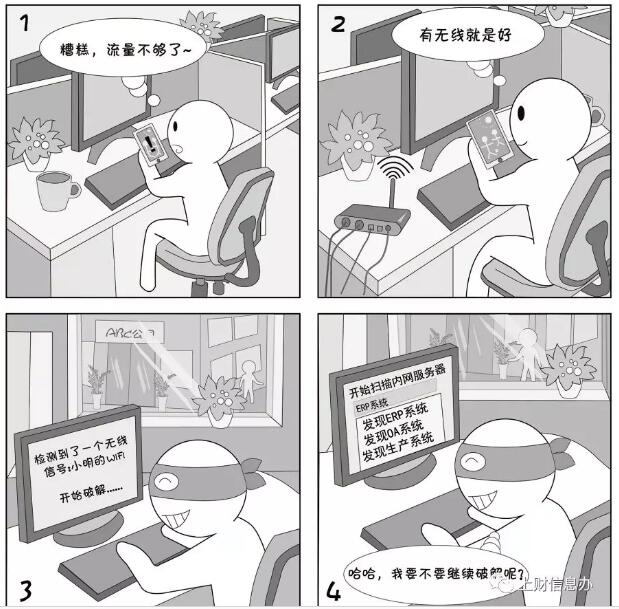 無線路由器有較多的安全隱患,比如之前的wep認(rèn)證能很輕易破解。個(gè)人架設(shè)無線路由器,如果配置不當(dāng),家用最多導(dǎo)致蹭網(wǎng)或個(gè)人資料泄露,但在單位使用可能會(huì)導(dǎo)致內(nèi)網(wǎng)被入侵,單位機(jī)密、客戶資料泄密,后果不堪設(shè)想。