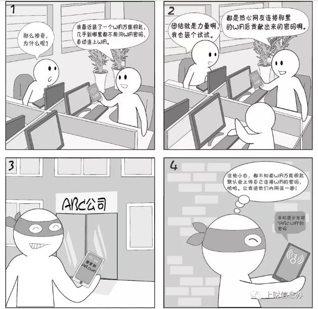 手機(jī)上的WIFI萬能鑰匙類的APP在安裝后默認(rèn)設(shè)置會(huì)自動(dòng)上傳你所連接的WIFI的密碼。這些密碼一般不會(huì)明文給出,只會(huì)在連接WIFI時(shí)自動(dòng)輸入,但曾爆出漏洞用一個(gè)APP能讀出檢測(cè)到WIFI的密碼,這樣就可以用筆記本接入WIFI使用更強(qiáng)大的攻擊工具了。