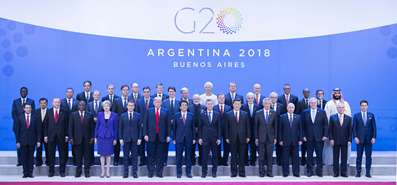 當(dāng)?shù)貢r(shí)間11月30日,二十國集團(tuán)領(lǐng)導(dǎo)人第十三次峰會(huì)在阿根廷布宜諾斯艾利斯舉行。國家主席習(xí)近平出席第一階段會(huì)議并發(fā)表題為《登高望遠(yuǎn),牢牢把握世界經(jīng)濟(jì)正確方向》的重要講話。這是習(xí)近平同其他與會(huì)領(lǐng)導(dǎo)人合影。 新華社記者 李濤 攝