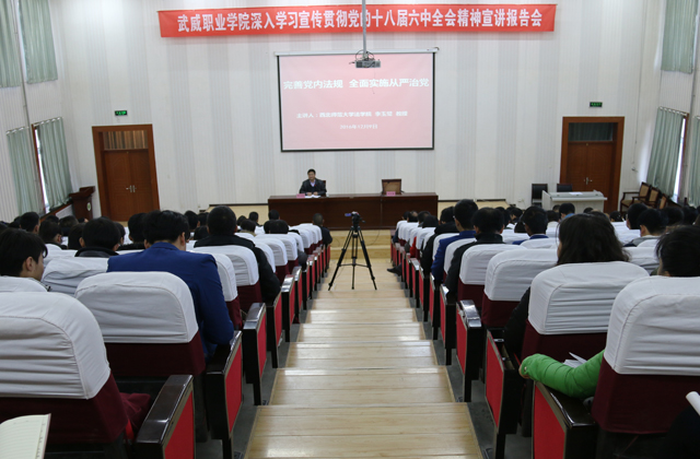 為全面準(zhǔn)確學(xué)習(xí)宣傳黨的十八屆六中全會(huì)精神,12月9日上午,學(xué)院在尚德樓正德廳舉辦“深入學(xué)習(xí)宣傳貫徹黨的十八屆六中全會(huì)精神宣講報(bào)告會(huì)”,邀請西北師范大學(xué)教授李玉璧作題為《完善黨內(nèi)法規(guī) 全面實(shí)施從嚴(yán)治黨》的宣講報(bào)告。學(xué)院副院長王永緒、潘玉華、田迎春,中層干部及師生代表200余人參加報(bào)告會(huì)。田迎春主持宣講報(bào)告會(huì)。