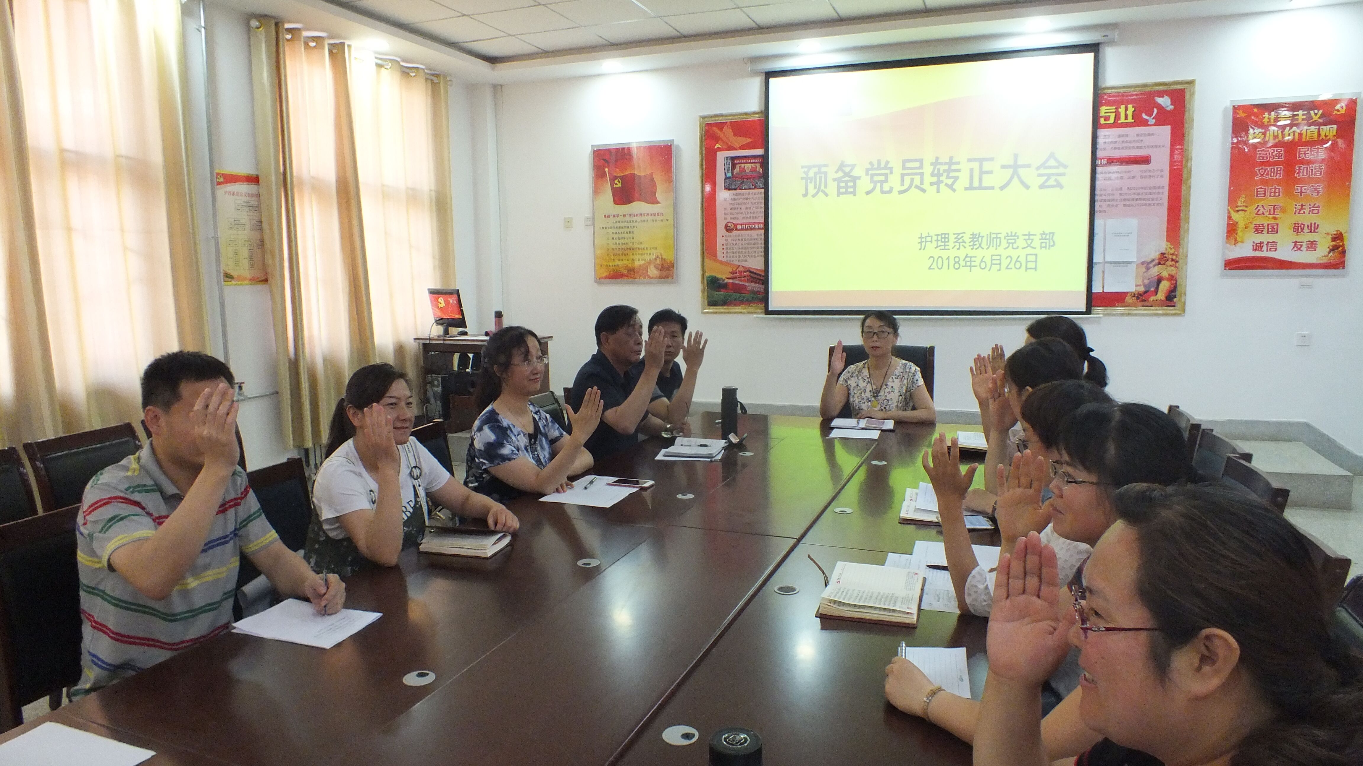 會議采取申請人暫時回避的方式進行舉手投票,全票通過了預備黨員的轉(zhuǎn)正申請。最后,支部黨員在韓曉萍的帶領(lǐng)下,與新黨員一同宣讀入黨誓詞。