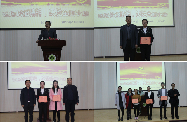 為紀(jì)念紅軍長(zhǎng)征勝利80周年,激發(fā)師生弘揚(yáng)偉大的長(zhǎng)征精神,同時(shí)為豐富校園文化生活,展示青春正能量,藥學(xué)系團(tuán)總支依據(jù)院團(tuán)委的通知精神和系團(tuán)學(xué)工作委員會(huì)關(guān)于增加學(xué)生課余活動(dòng)的會(huì)議要求,于10月30日在正德廳組織開(kāi)展了“傳承長(zhǎng)征精神,筑我青春夢(mèng)想”主題演講比賽。藥學(xué)系主任魏潤(rùn)明出席了本次活動(dòng),各班班主任擔(dān)任本次比賽評(píng)委,2016級(jí)全體學(xué)生和2015級(jí)各班學(xué)生代表觀看了比賽。