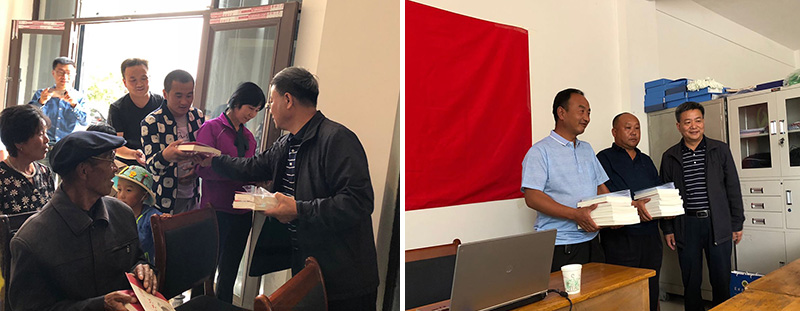 課后,學(xué)院領(lǐng)導(dǎo)把《習(xí)近平新時(shí)代中國(guó)特色社會(huì)主義思想學(xué)習(xí)綱要》《習(xí)近平新時(shí)代中國(guó)特色社會(huì)主義思想三十講》《全國(guó)優(yōu)秀共產(chǎn)黨員風(fēng)采錄》《新時(shí)代黨支部規(guī)范化建設(shè)工作實(shí)用手冊(cè)》和“掃黑除惡”知識(shí)手冊(cè)等14類50多冊(cè)黨建書籍分別贈(zèng)送給蘆草溝村、尚家臺(tái)村黨支部和駐村工作隊(duì),還向聽課的村民黨員贈(zèng)送《習(xí)近平的七年知青歲月》等書籍。進(jìn)村入戶的幫扶干部向幫扶戶村民黨員贈(zèng)送了黨建書籍。共贈(zèng)送100多冊(cè)價(jià)值2700多元黨建書籍和掃黑除惡手冊(cè)。