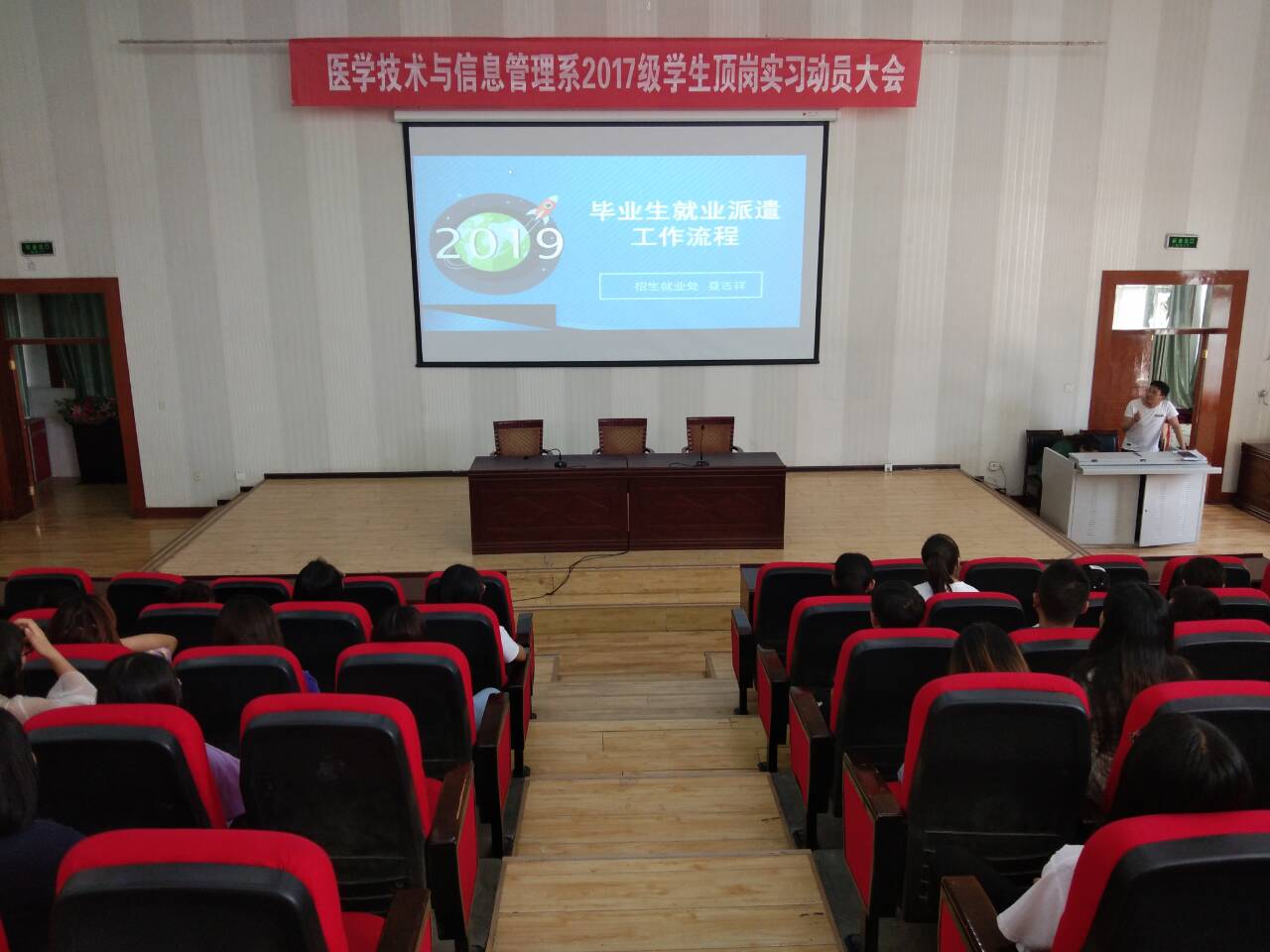 為了進一步做好2017級學生實習工作,拓寬同學們畢業(yè)后就業(yè)渠道,7月2日,醫(yī)學技術學院在尚德樓正德廳召開了2017級學生頂崗實習動員暨就業(yè)指導會議,參加本次會議的有蔡濟眾副主任、17級全體班主任及17級全體學生。會議由系部招生就業(yè)工作負責人李培良主持。