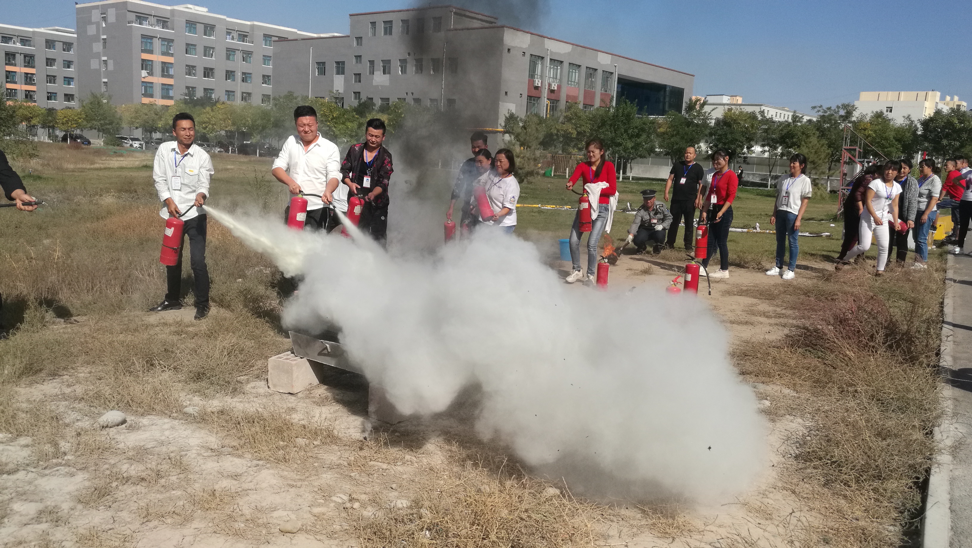 培訓(xùn)中,保衛(wèi)處負(fù)責(zé)人向參加人員講解了火災(zāi)應(yīng)急處置、消防設(shè)施使用及維護(hù)等方面的知識(shí)。隨后,所有參加人員在操場(chǎng)空地進(jìn)行了干粉滅火器滅火演練,每位參加人員都情緒飽滿、積極參與,最終有序完成了培訓(xùn)。