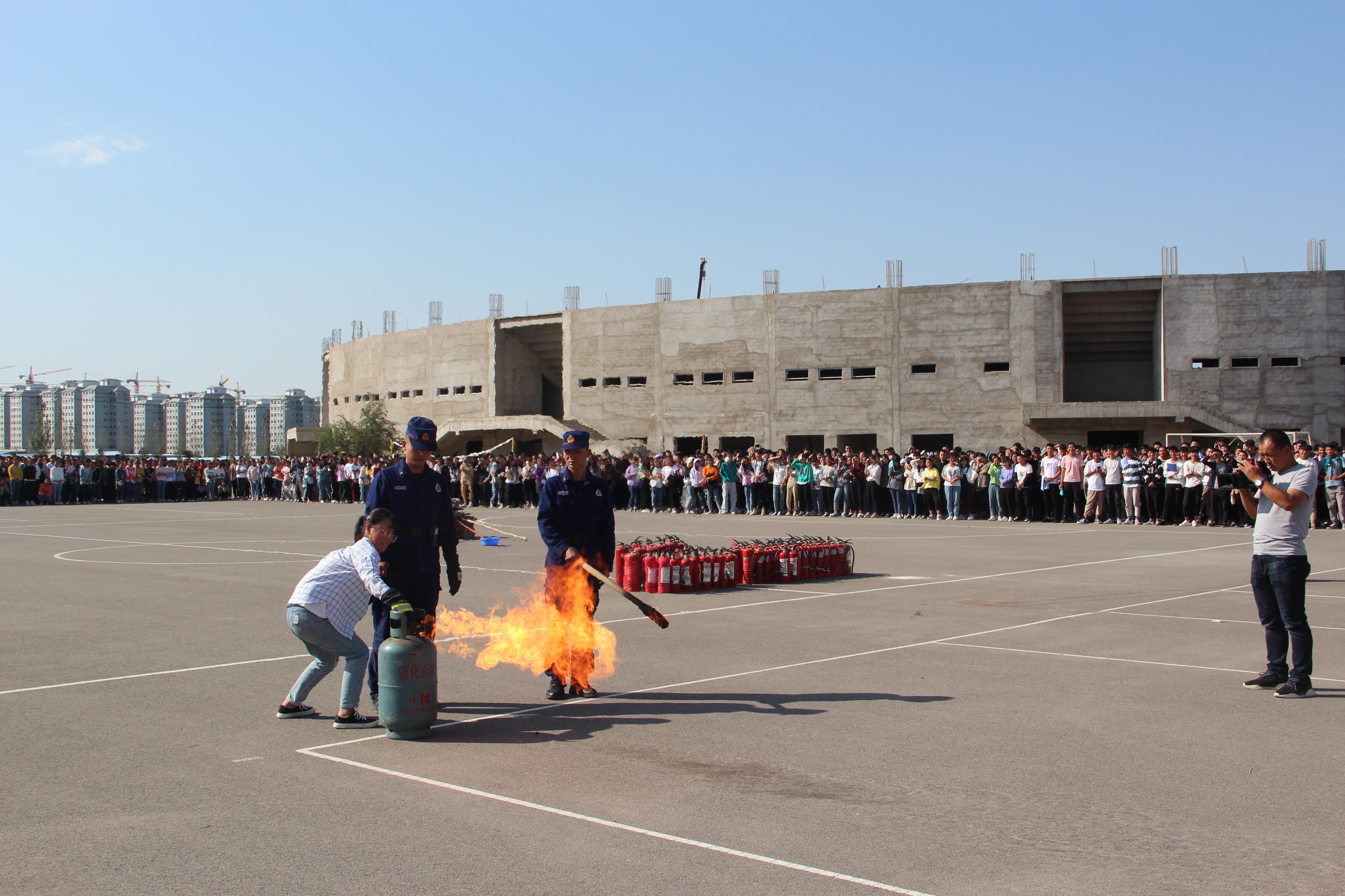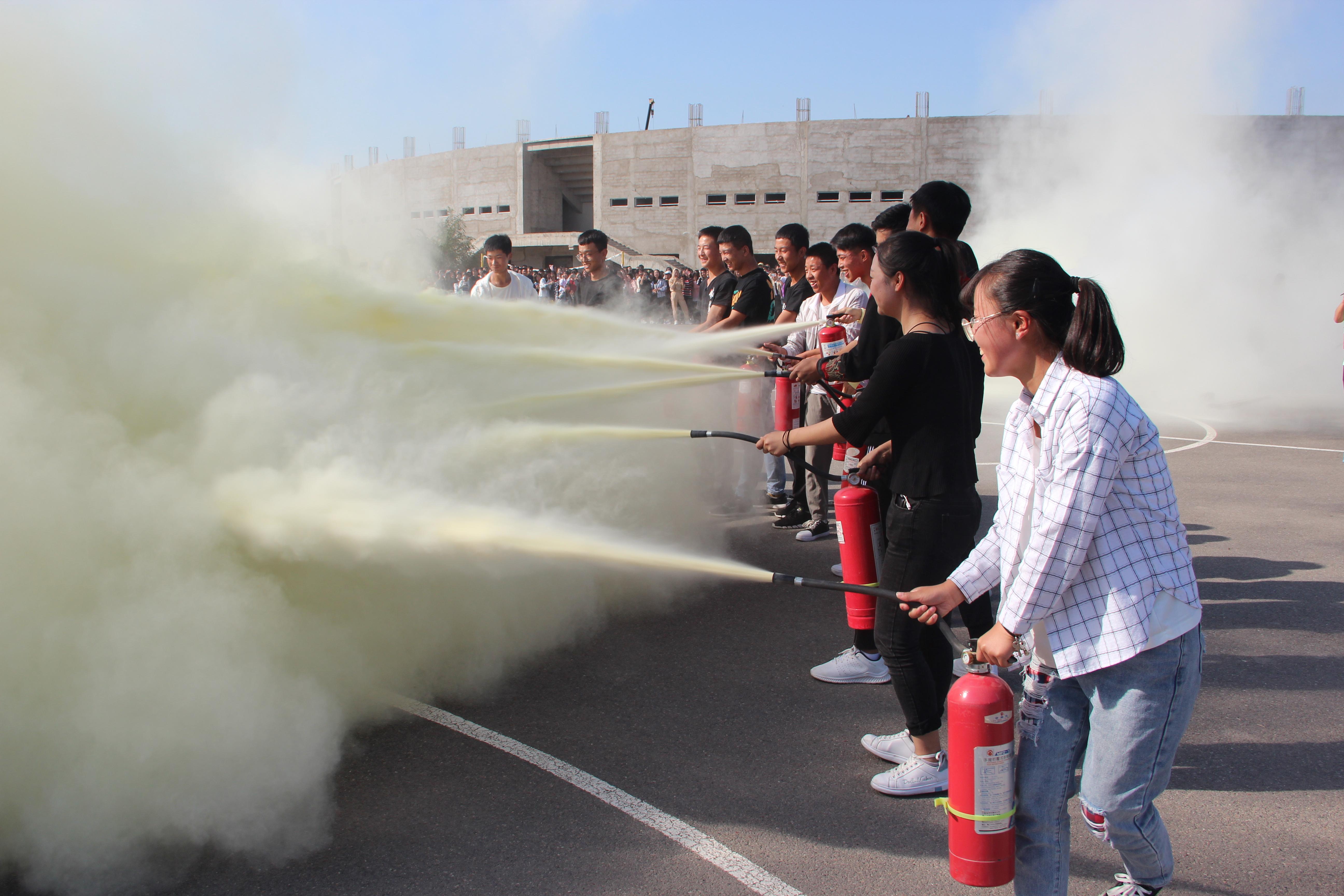 隨后,2019級新生整隊(duì)到操場參加了滅火演練。在消防隊(duì)員的講解和示范下,同學(xué)們現(xiàn)場學(xué)習(xí)了應(yīng)急逃生和消防安全常識,部分師生代表、食堂工作人員親身體驗(yàn)了處置滅火器著火液化氣瓶、干粉滅火、通過模擬煙室逃生等操作。