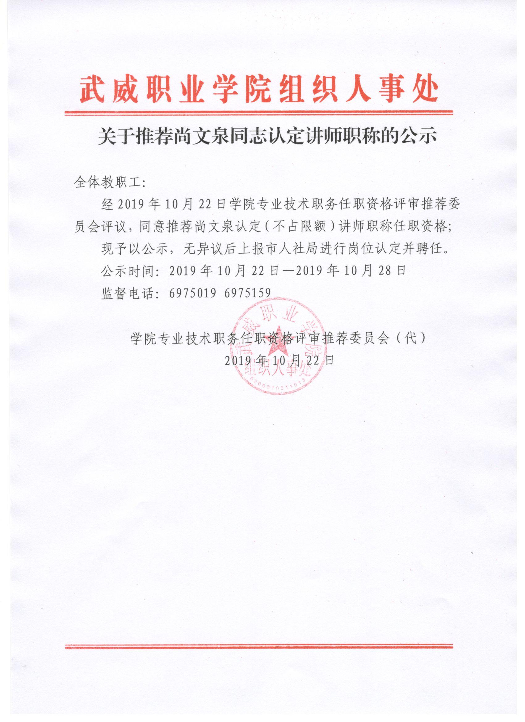 關(guān)于推薦尚文泉同志認(rèn)定講師職稱的公示