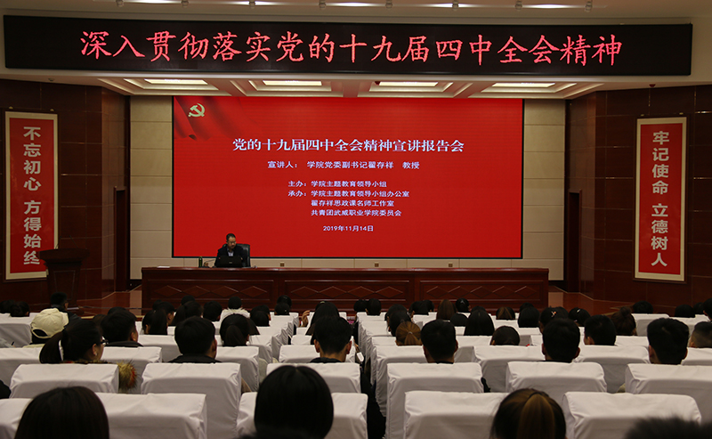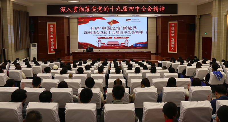 11月14日下午,黨委副書記翟存祥教授在學院菁英廳作黨的十九屆四中全會精神宣講報告,學院各教學系輔導員、學生黨員、入黨積極分子及學生干部共兩百余人聆聽了宣講。