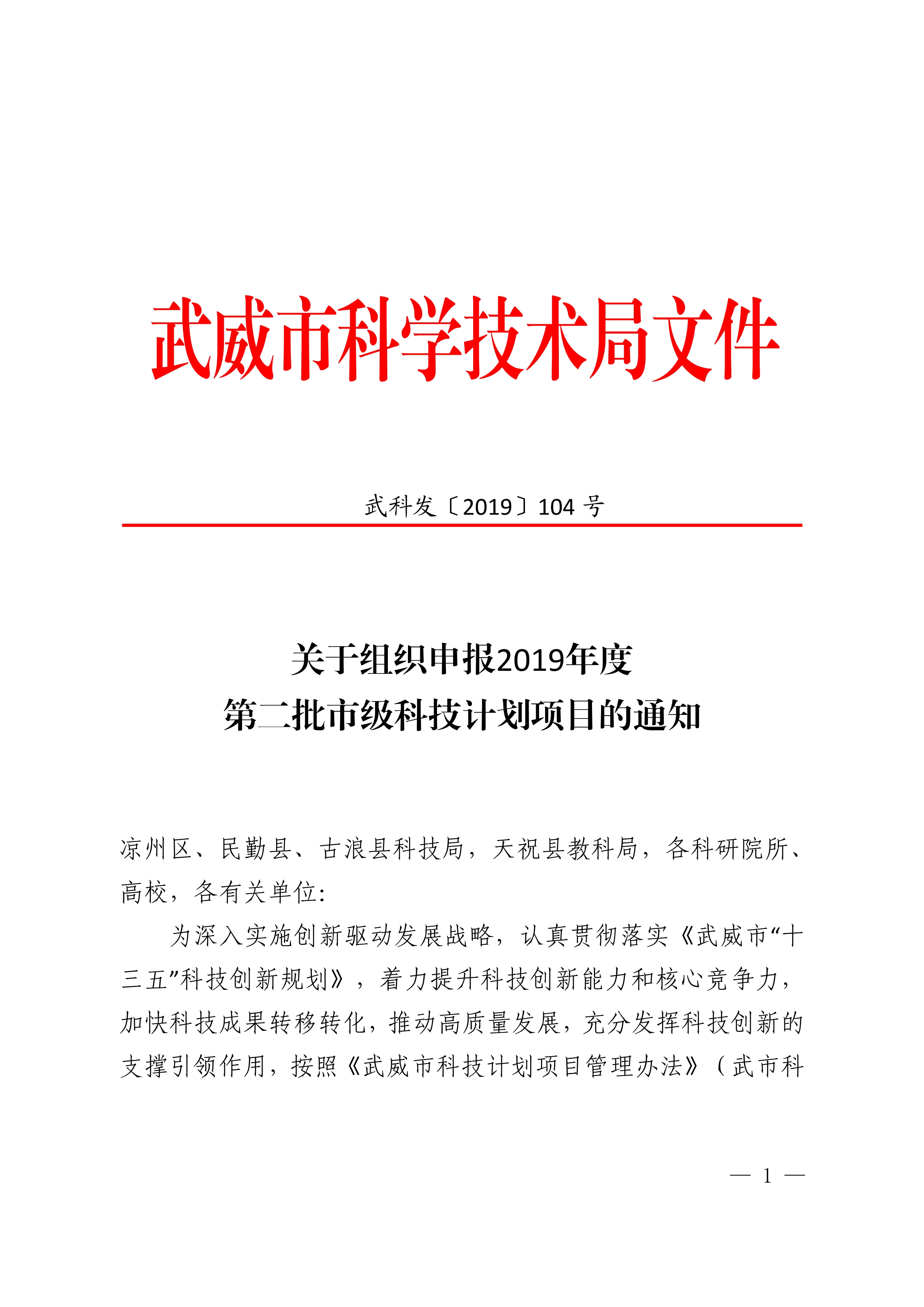 轉(zhuǎn)發(fā)武威市科學(xué)技術(shù)局關(guān)于組織申報(bào)2019年度第二批市級(jí)科技計(jì)劃項(xiàng)目的通知