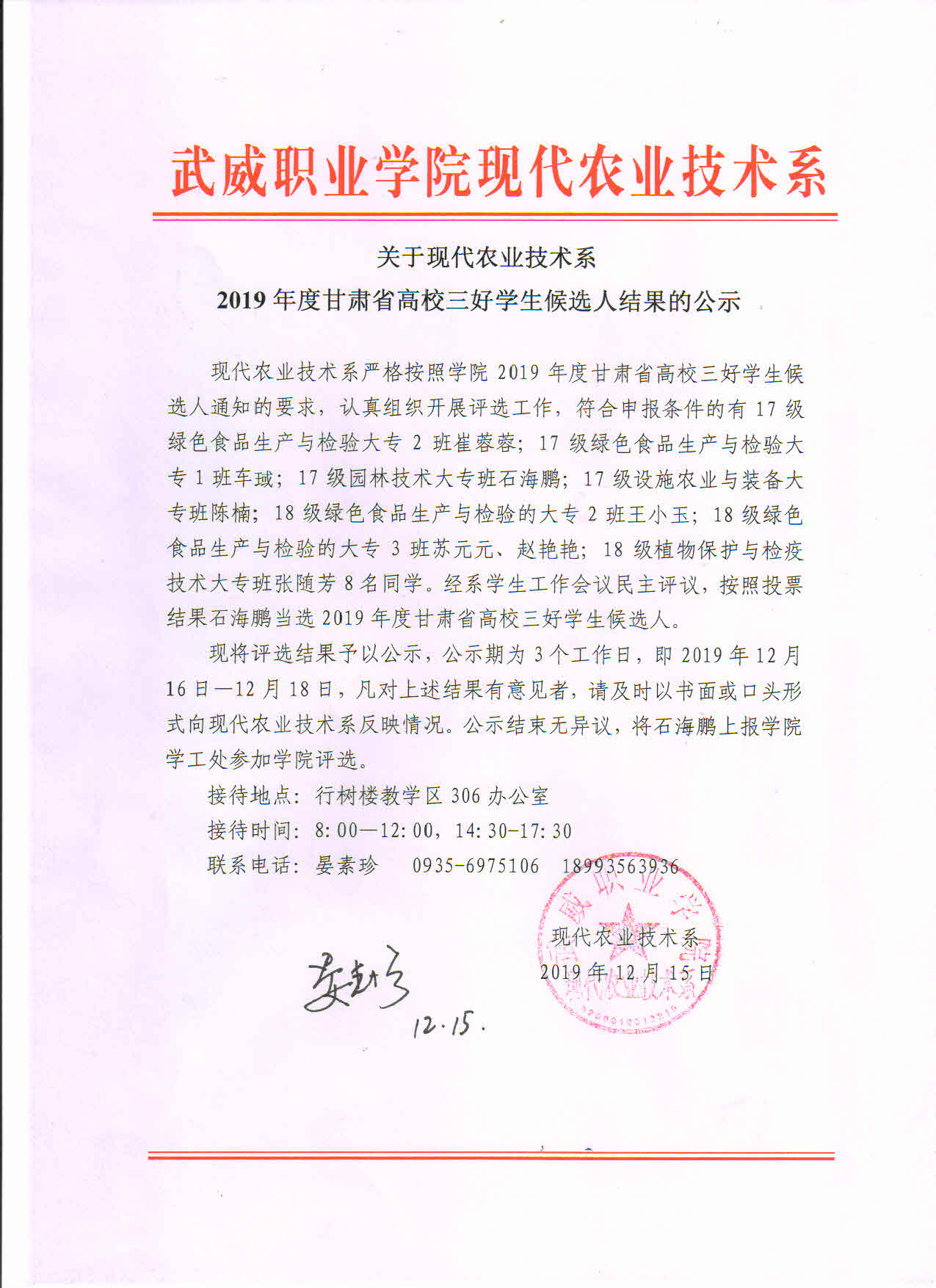 關(guān)于現(xiàn)代農(nóng)業(yè)技術(shù)系2019年度甘肅省高校三好學生候選人結(jié)果的公示
