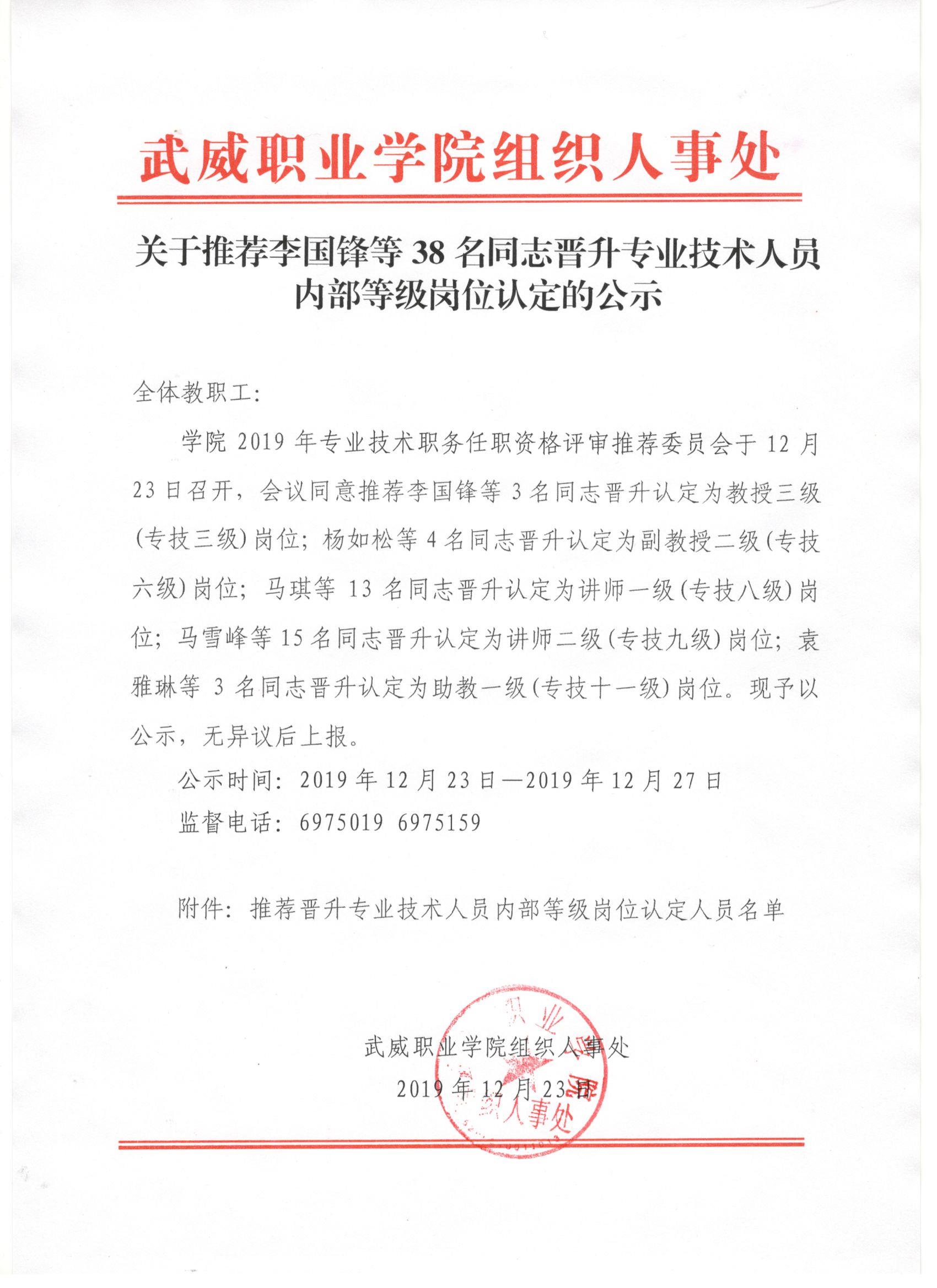關于推薦李國鋒等38名同志晉升專業(yè)技術人員內部等級崗位認定的公示