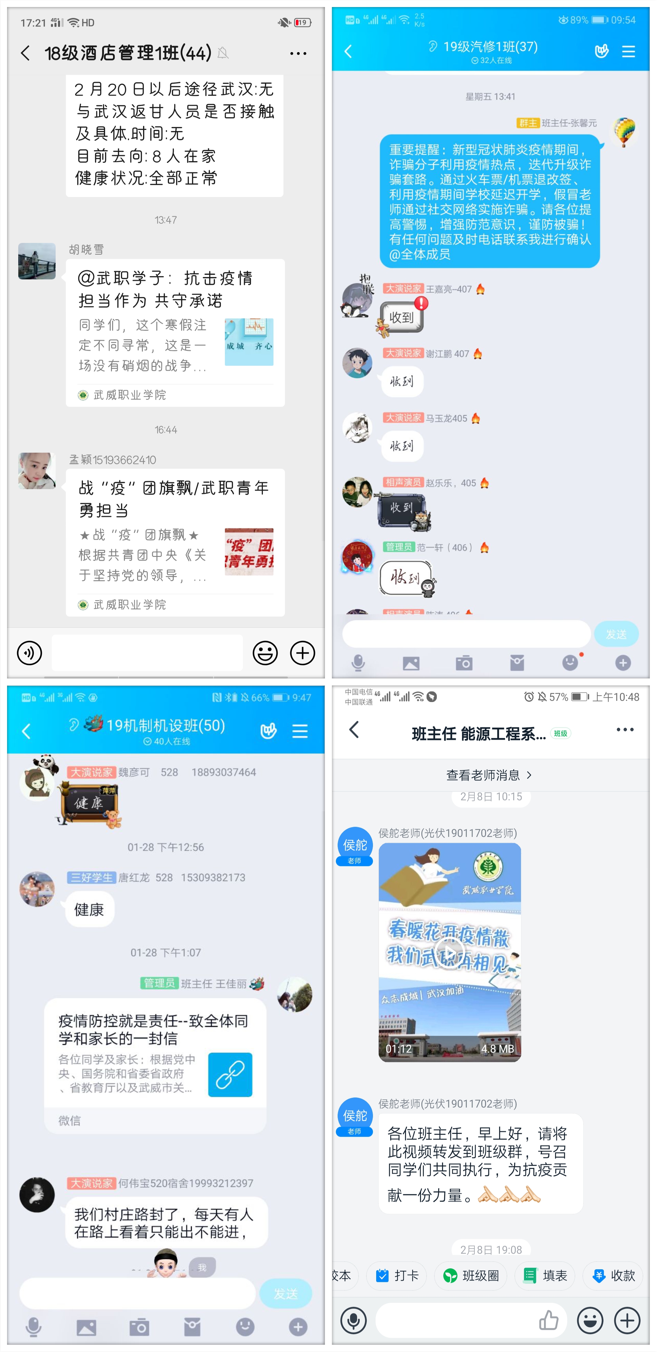 學(xué)生工作處及時(shí)發(fā)布了致學(xué)生和家長的一封信《疫情防控就是責(zé)任》,團(tuán)委制作和推送了《春暖花開疫情散 我們武職再相見》溫馨提示短片和《@武職學(xué)子:抗擊疫情 擔(dān)當(dāng)作為 共守承諾》倡議,用生動(dòng)形象的表述要求和提醒同學(xué)們不得提前返校,做好個(gè)人防護(hù)措施,遵守當(dāng)?shù)匾咔榉揽馗黜?xiàng)要求,做到不信謠不傳謠,及時(shí)向?qū)W院報(bào)送個(gè)人防疫相關(guān)信息,不瞞報(bào)不慌報(bào)。各院系輔導(dǎo)員和班主任都會(huì)第一時(shí)間在學(xué)生群里轉(zhuǎn)發(fā),同時(shí)把學(xué)院網(wǎng)站和微信平臺(tái)上科學(xué)的防控知識(shí)和上級(jí)的有關(guān)精神及時(shí)傳達(dá)給學(xué)生,當(dāng)好疫情防控的宣傳員,做到戰(zhàn)疫有“力”。