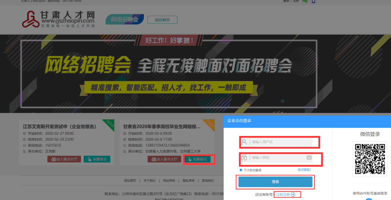 1.登錄甘肅人才網(wǎng)(www.gszhaopin.com),點(diǎn)擊菜單欄“招聘會”—“網(wǎng)絡(luò)招聘會”進(jìn)入二級頁面菜單,進(jìn)入網(wǎng)絡(luò)招聘會列表—選擇“武威職業(yè)學(xué)院2020屆醫(yī)藥衛(wèi)生類畢業(yè)生網(wǎng)絡(luò)視頻雙選會”點(diǎn)擊“我要報(bào)名”按鈕,登錄企業(yè)后臺(無賬號點(diǎn)擊“立即注冊”,資質(zhì)通過審核后再報(bào)名),待定審核。