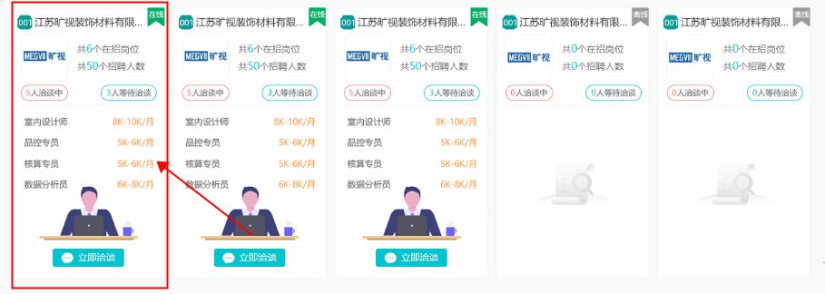 一是主動在“新入場求職者”標(biāo)簽下,瀏覽入場求職人員簡歷,點(diǎn)擊“立即洽談”對意向洽談人員發(fā)出溝通申請,并進(jìn)行面試洽談。如下圖: