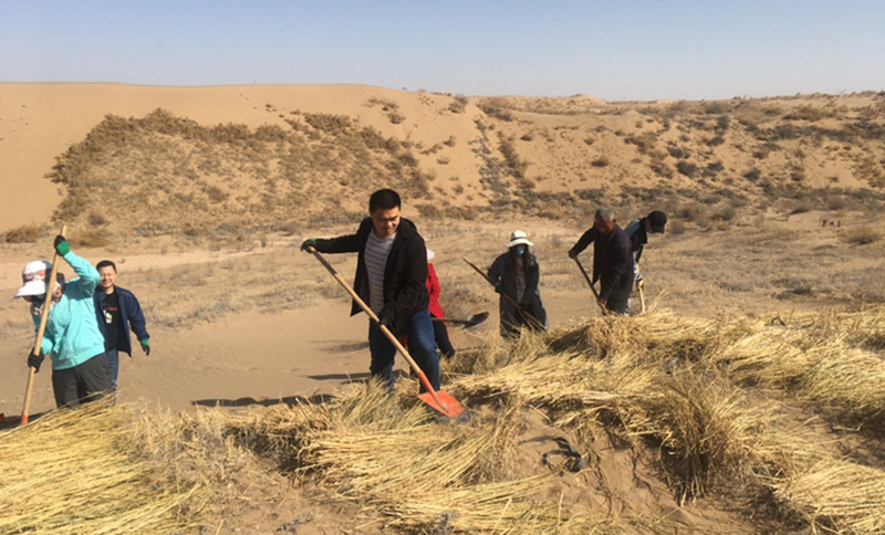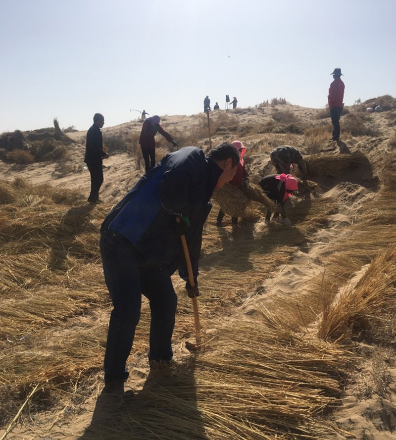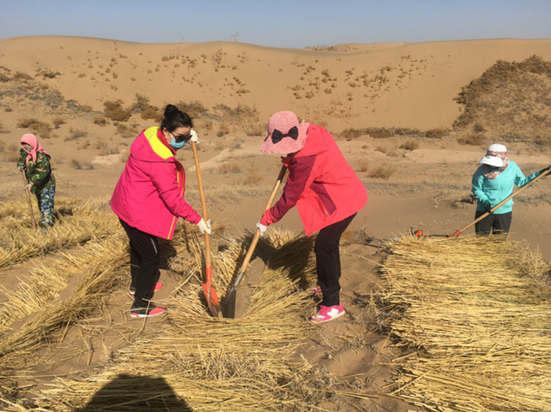 全體壓沙人員不怕吃苦、不怕流汗,爭先恐后投入壓沙勞動中。分工合作,有的開溝,有的鋪草,有的壓沙,整齊的麥草方格由一排排向一片片不斷延伸,一個個沙丘逐漸被麥草網(wǎng)格牢牢鎖住。