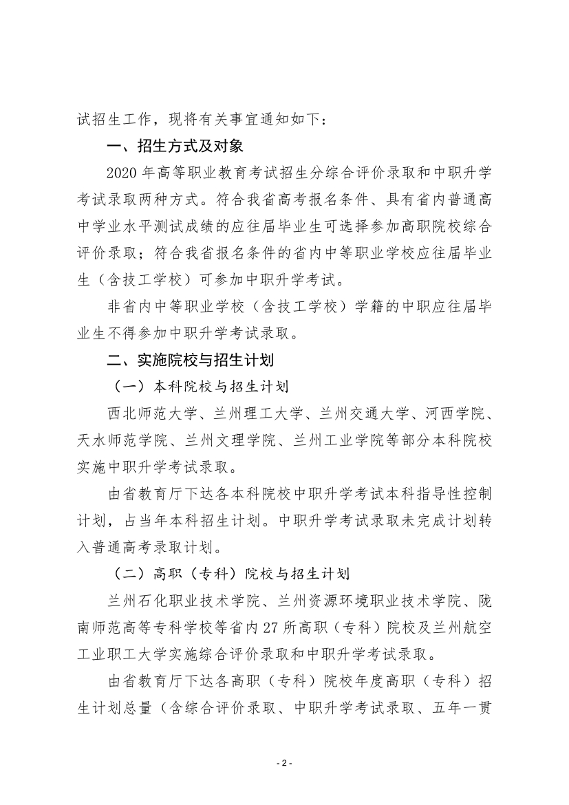 關(guān)于做好2020年甘肅省高等職業(yè)教育考試招生工作的通知