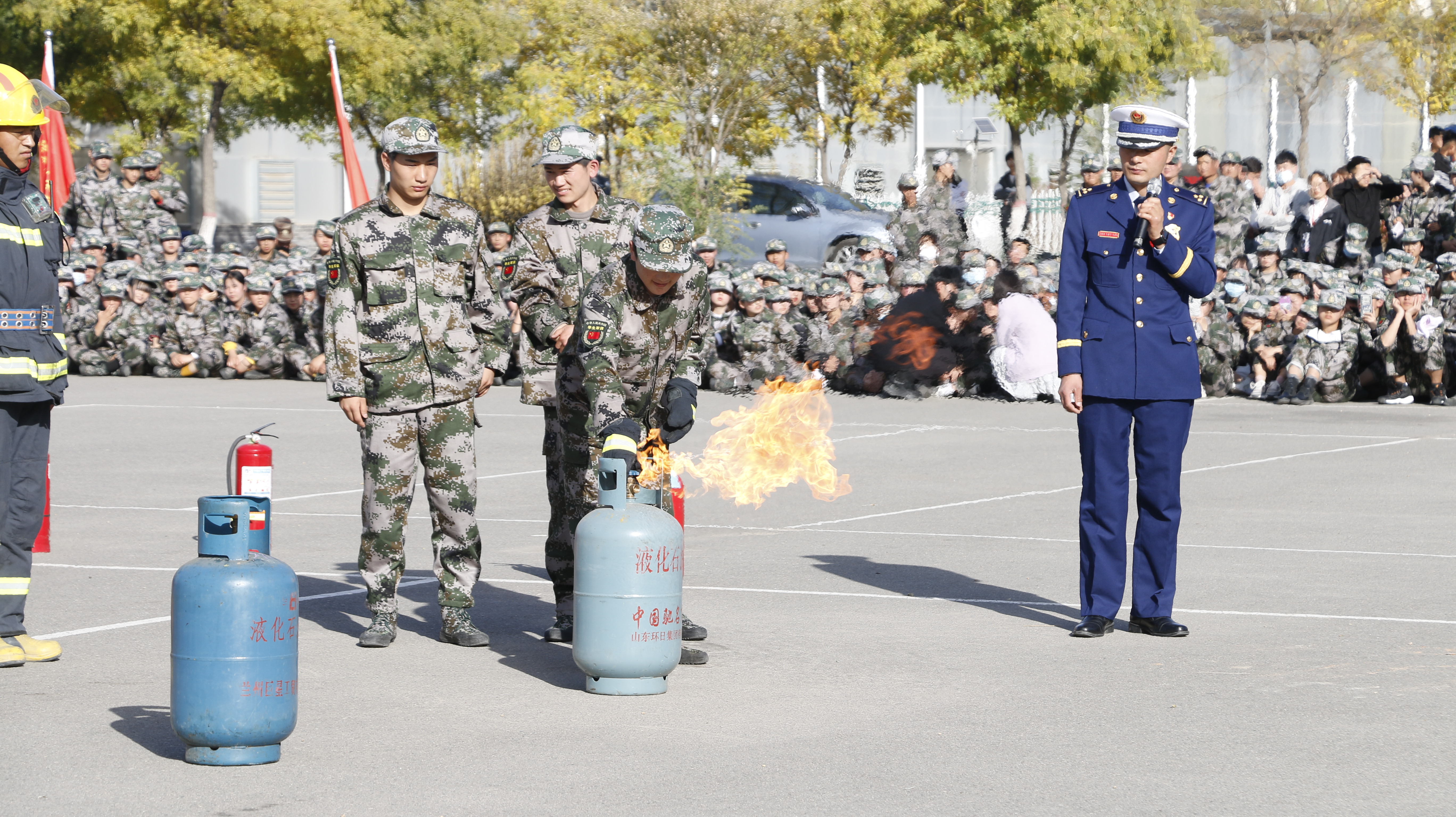 隨后,2020級(jí)全體新生整隊(duì)到操場(chǎng)參加了滅火演練。在消防救援中隊(duì)指戰(zhàn)員的講解和示范下,同學(xué)們學(xué)習(xí)了應(yīng)急逃生、火災(zāi)報(bào)警和滅火器使用等消防安全常識(shí),學(xué)生代表體驗(yàn)了處置液化氣瓶滅火、油鍋滅火、干粉滅火器滅火等操作,在實(shí)戰(zhàn)中提高了消防應(yīng)急能力。