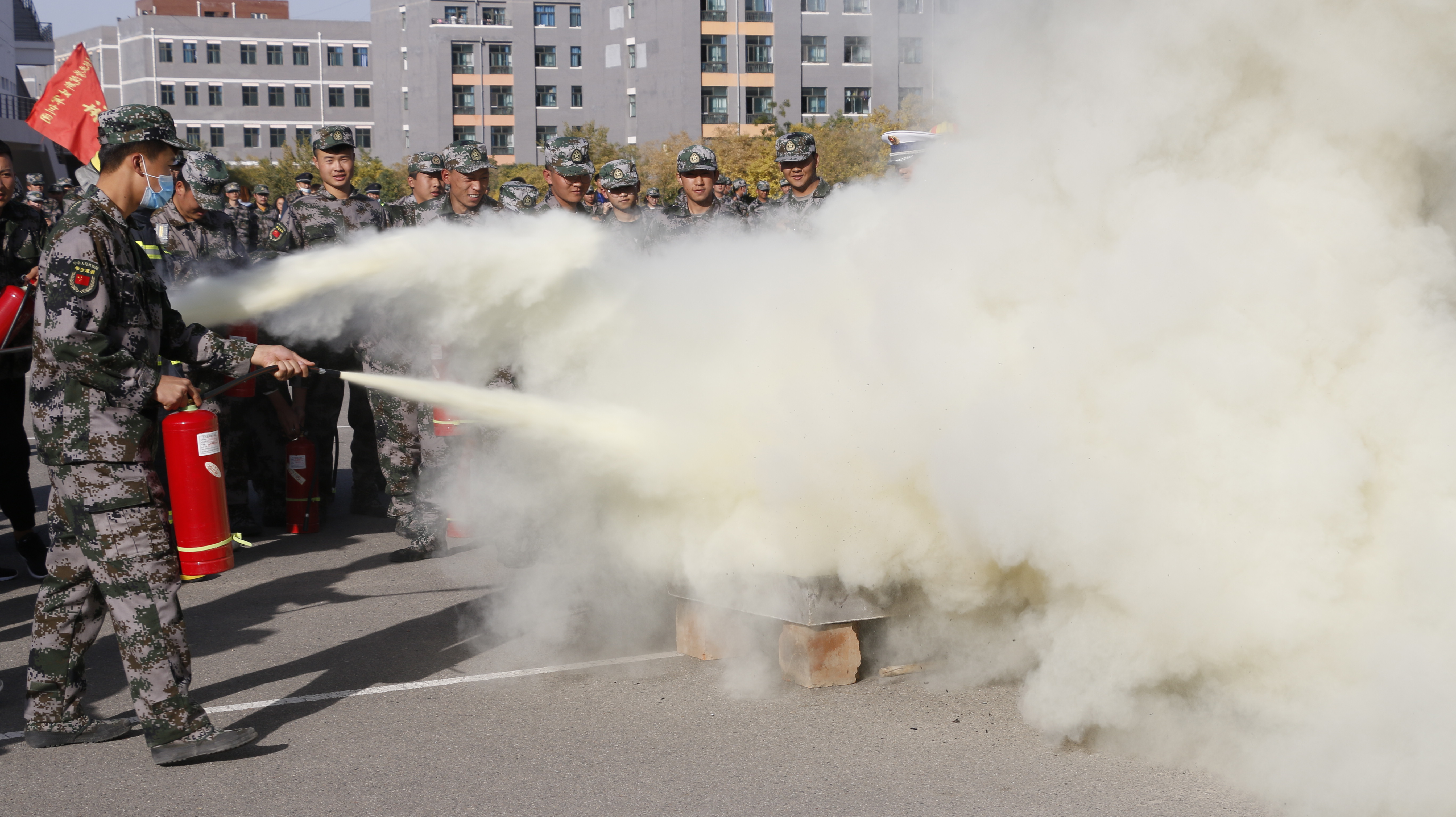 隨后,2020級全體新生整隊到操場參加了滅火演練。在消防救援中隊指戰(zhàn)員的講解和示范下,同學們學習了應急逃生、火災報警和滅火器使用等消防安全常識,學生代表體驗了處置液化氣瓶滅火、油鍋滅火、干粉滅火器滅火等操作,在實戰(zhàn)中提高了消防應急能力。