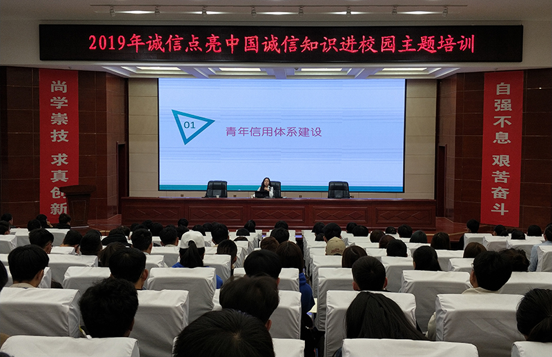 為進(jìn)一步拓寬誠信知識宣傳的深度和廣度,提升我院青年學(xué)生的誠信意識,增強同學(xué)們信用理念和防范重大風(fēng)險的意識, 3月30日上午,2019年“誠信點亮中國”誠信知識進(jìn)校園活動在菁英廳舉辦,團(tuán)省委青年信用體系建設(shè)領(lǐng)導(dǎo)小組辦公室主任高振葉作了《青年信用體系建設(shè)與志愿中國》主題講座,團(tuán)市委少工委副主任許娜出席活動,院團(tuán)委教師和220學(xué)生代表參加了培訓(xùn)。
