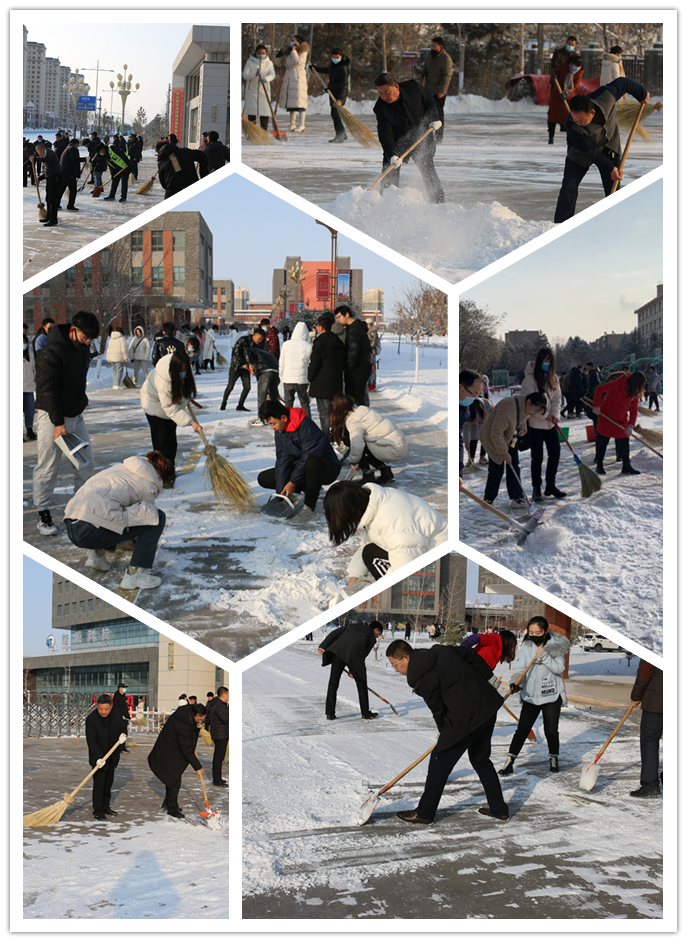 路面積雪既給過往師生和行人帶來行走不便,也存在安全隱患。學(xué)院領(lǐng)導(dǎo)及部分師生手拿掃帚、鐵鍬等工具,爭(zhēng)先恐后、相互配合,認(rèn)真清掃校園道路積雪,鏟除路面積冰。經(jīng)過大家持續(xù)努力,原本積雪結(jié)冰的路面恢復(fù)了正常,不僅干凈了,也消除了安全隱患。