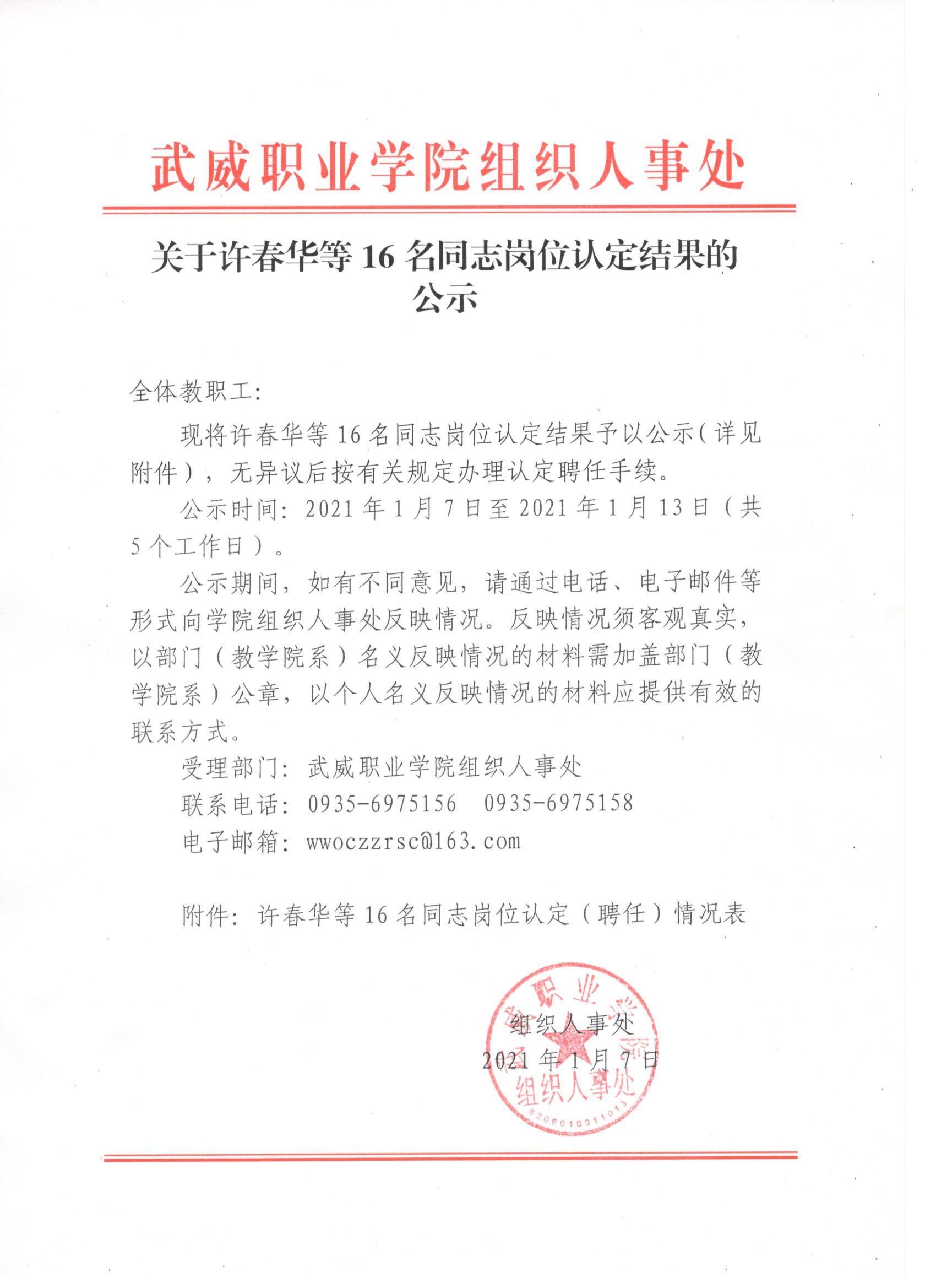 關(guān)于許春華等16名同志崗位認(rèn)定結(jié)果的公示