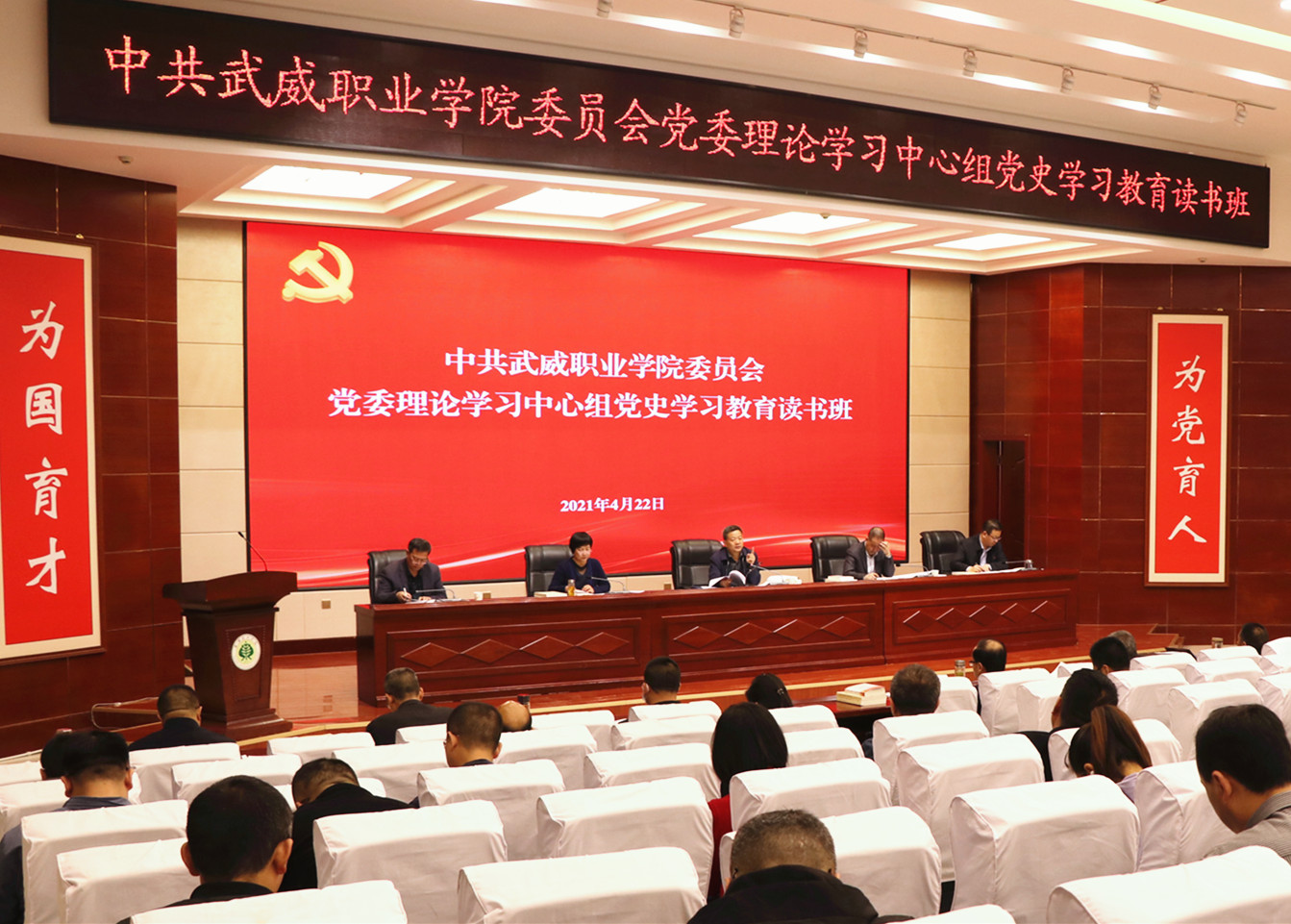 正值第26個(gè)“世界讀書(shū)日”到來(lái)之際,4月22上午,學(xué)院黨委理論學(xué)習(xí)中心組黨史學(xué)習(xí)教育讀書(shū)班暨學(xué)習(xí)(擴(kuò)大)會(huì)議在大學(xué)生活動(dòng)中心菁英廳舉行。學(xué)院領(lǐng)導(dǎo)班子成員、全體中層干部、各基層黨組織書(shū)記、專(zhuān)職組織員和支委委員共100人參加讀書(shū)班學(xué)習(xí)。黨委書(shū)記、院長(zhǎng)趙明主持開(kāi)班式并講話(huà)。