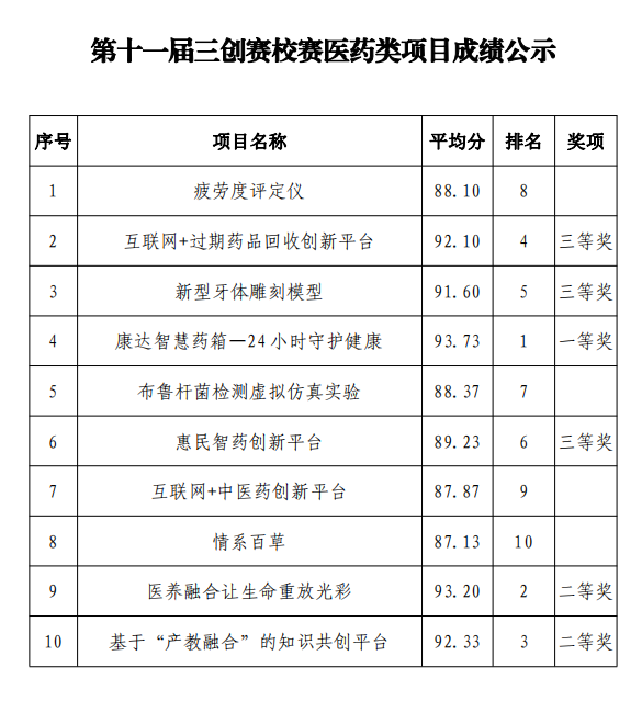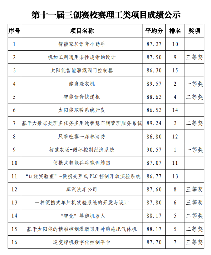 按照第十一屆三創(chuàng)賽省賽組委會(huì)要求,學(xué)院于4月24日在創(chuàng)新創(chuàng)業(yè)中心舉辦了校賽,經(jīng)學(xué)生團(tuán)隊(duì)申報(bào)、現(xiàn)場(chǎng)答辯及專(zhuān)家評(píng)審環(huán)節(jié),校賽已圓滿(mǎn)完成。按照校賽方案,一等獎(jiǎng)不超過(guò)參賽隊(duì)數(shù)的 10%,二等獎(jiǎng)不超過(guò)參賽隊(duì)數(shù)的 20%,三等獎(jiǎng)不超過(guò)參賽隊(duì)數(shù)的 30%?,F(xiàn)將第十一屆三創(chuàng)賽校賽獲獎(jiǎng)項(xiàng)目成績(jī)和獲獎(jiǎng)名次予以公示,公示期三日。