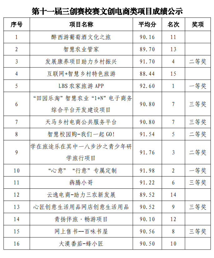 第十一屆三創(chuàng)賽武威職業(yè)學(xué)院校賽擬獲獎(jiǎng)項(xiàng)目及成績(jī)公示