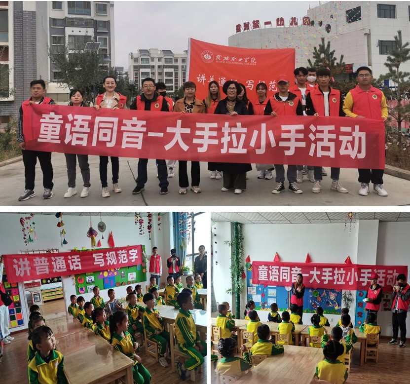 為認(rèn)真貫徹落實(shí)《教育部等九部門關(guān)于開展第24屆全國推廣普通話宣傳周活動的通知》(教語用函〔2021〕1號)、《甘肅省語言文字工作委員會等九部門關(guān)于開展第24屆全國推廣普通話宣傳周活動的通知》要求,進(jìn)一步加大國家通用語言文字推廣力度,9月14日,學(xué)院推普志愿隊(duì)師生在古浪綠洲小鎮(zhèn)第一幼兒園開展童語同音-大手拉小手推普活動,推普志愿隊(duì)詳細(xì)了解小鎮(zhèn)幼兒教師及兒童的普通話普及情況,并與大、中班幼兒進(jìn)行了有趣的互動活動。