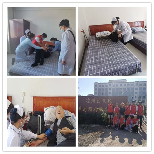 武威市涼州區(qū)雙城鎮(zhèn)敬老院目前共居住有102位老人,均為孤寡老人和五保戶,其中還有一部分殘疾老人。在敬老院里,志愿者們首先與院內(nèi)的八位照護(hù)員進(jìn)行了交流,向他們學(xué)習(xí)了如何照護(hù)老人。隨后,在院長(zhǎng)的引領(lǐng)下,指導(dǎo)老師與志愿者們探望了部分老人,并了解了老人們目前的生活和身體狀況。在老人的居室內(nèi),指導(dǎo)老師與身患?xì)埣驳睦先擞H切交談并為他們進(jìn)行了心理疏導(dǎo);志愿者們?yōu)槔先藗儨y(cè)量血壓、整理衣物、收拾屋子;在照護(hù)員的協(xié)助下,兩位志愿者為不能下床的老人進(jìn)行了翻身、拍背等護(hù)理。老人們均表示活動(dòng)很暖心,感謝志愿者們的愛(ài)心服務(wù)。