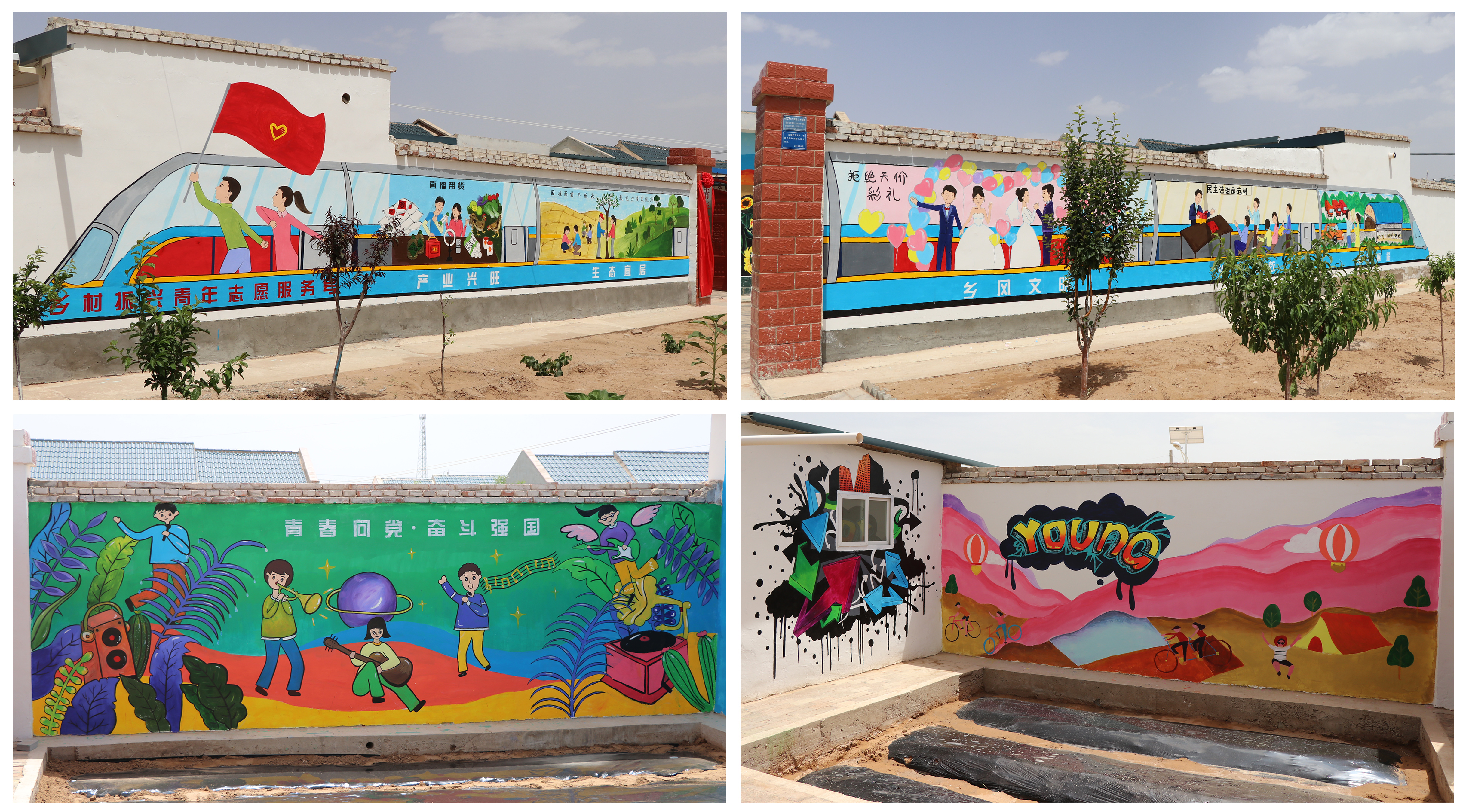 學院團委結合鄉(xiāng)村振興戰(zhàn)略和青年志愿服務工作特點對基地內外墻體進行了彩繪設計,并組織人文藝術教育系師生完成了手工繪制。外墻以鄉(xiāng)村振興青年志愿服務號高速列車為主題,融入了鄉(xiāng)村振興戰(zhàn)略20字方針,產業(yè)興旺、生態(tài)宜居、鄉(xiāng)風文明、治理有效、生活富裕5個方面的總體目標。內墻以青春時尚為主題,利用涂鴉的形式,展現青年人朝氣蓬勃、積極向上,青春向黨、奮斗強國的精神風貌。