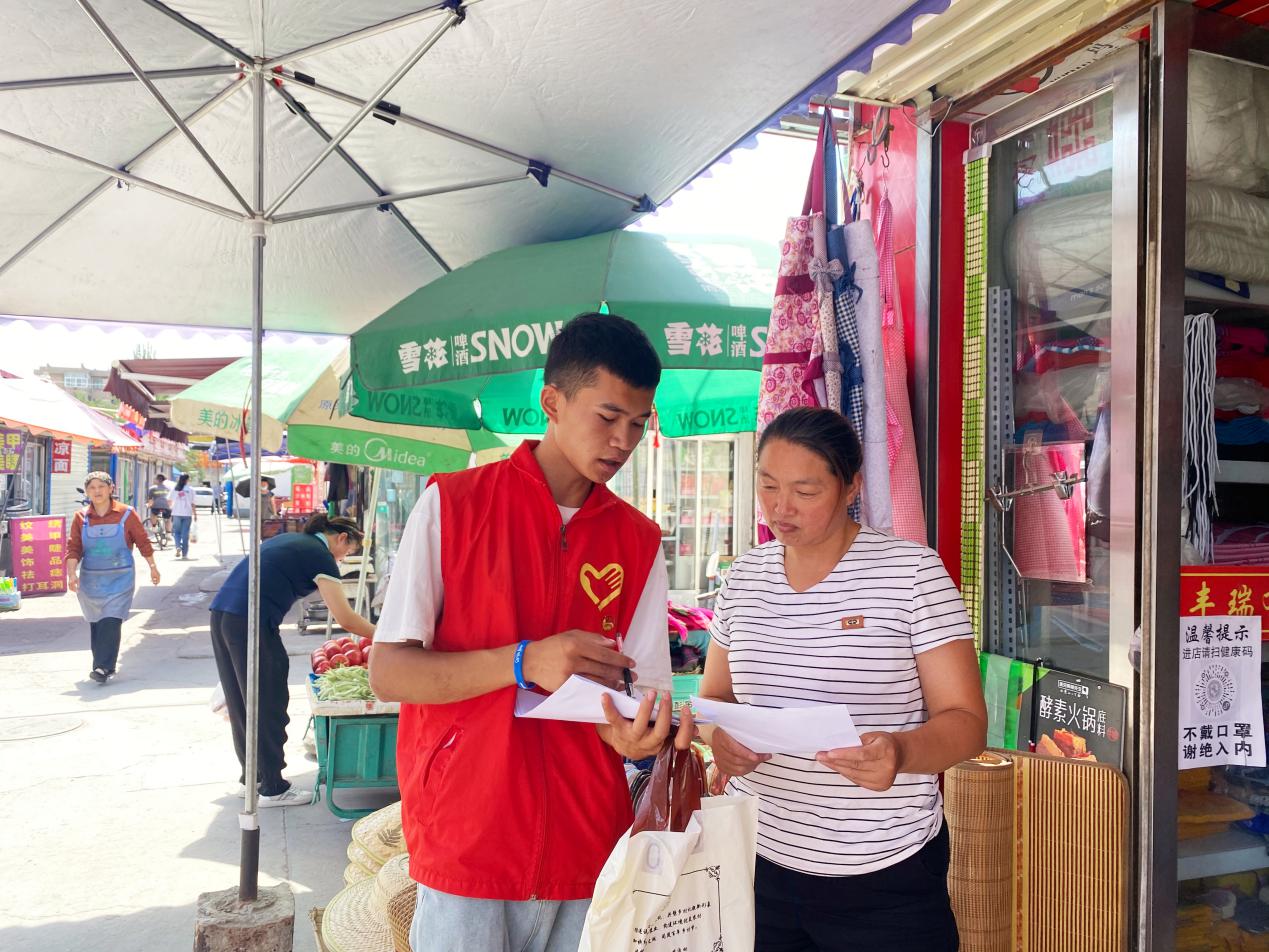 圖為實(shí)踐隊(duì)員在涼州區(qū)武南鎮(zhèn)為商戶發(fā)放推普資料