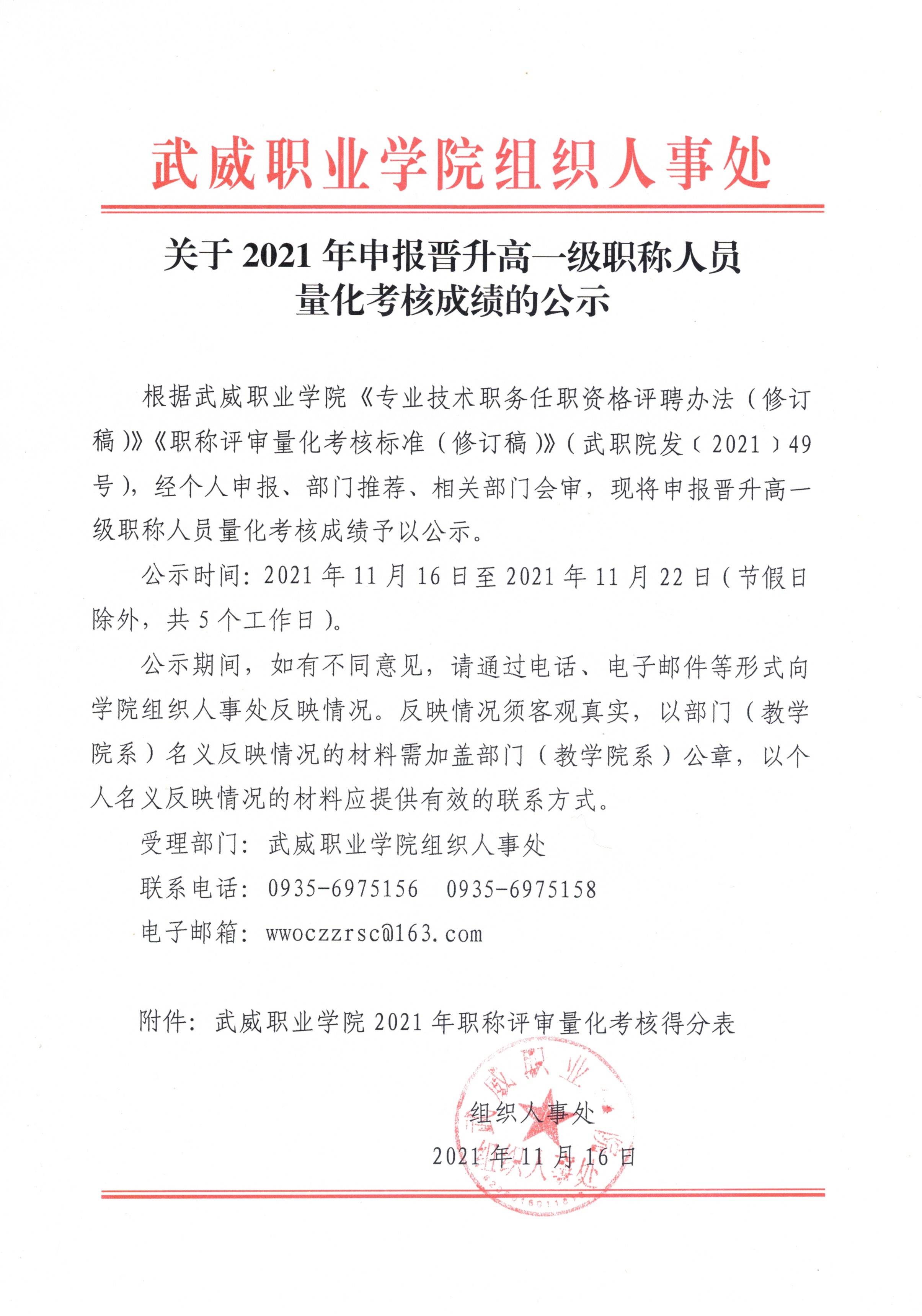 關(guān)于2021年申報(bào)晉升高一級(jí)職稱(chēng)人員量化考核成績(jī)的公示