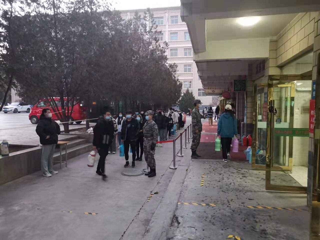 “同學(xué)們排隊時保持一米間距,不要聚集”“同學(xué)們上臺階的時候慢點走,注意腳下”,在堅定而溫暖的提示下,同學(xué)們整整齊齊的排好了隊等待打開水。他就是藥學(xué)系2019級藥學(xué)3班學(xué)生,原武警北京總隊執(zhí)勤某支隊退伍士兵常路楊同學(xué),本次疫情爆發(fā)后,他帶領(lǐng)學(xué)校10名退伍同學(xué)呈遞《請戰(zhàn)書》,主動請纓“抗疫”,參與到疫情防控工作中去,維護水房秩序、動員同學(xué)們戴好口罩、有序排隊。進入11月份以后,天氣越發(fā)的寒冷,但他們卻一如既往堅守著自己的崗位,持續(xù)奉獻(xiàn)著自己的光和熱,“寒風(fēng)裂征衣,飛雪裹戰(zhàn)袍”,他們用實際行動證明了中國軍人從來都不會后退。
