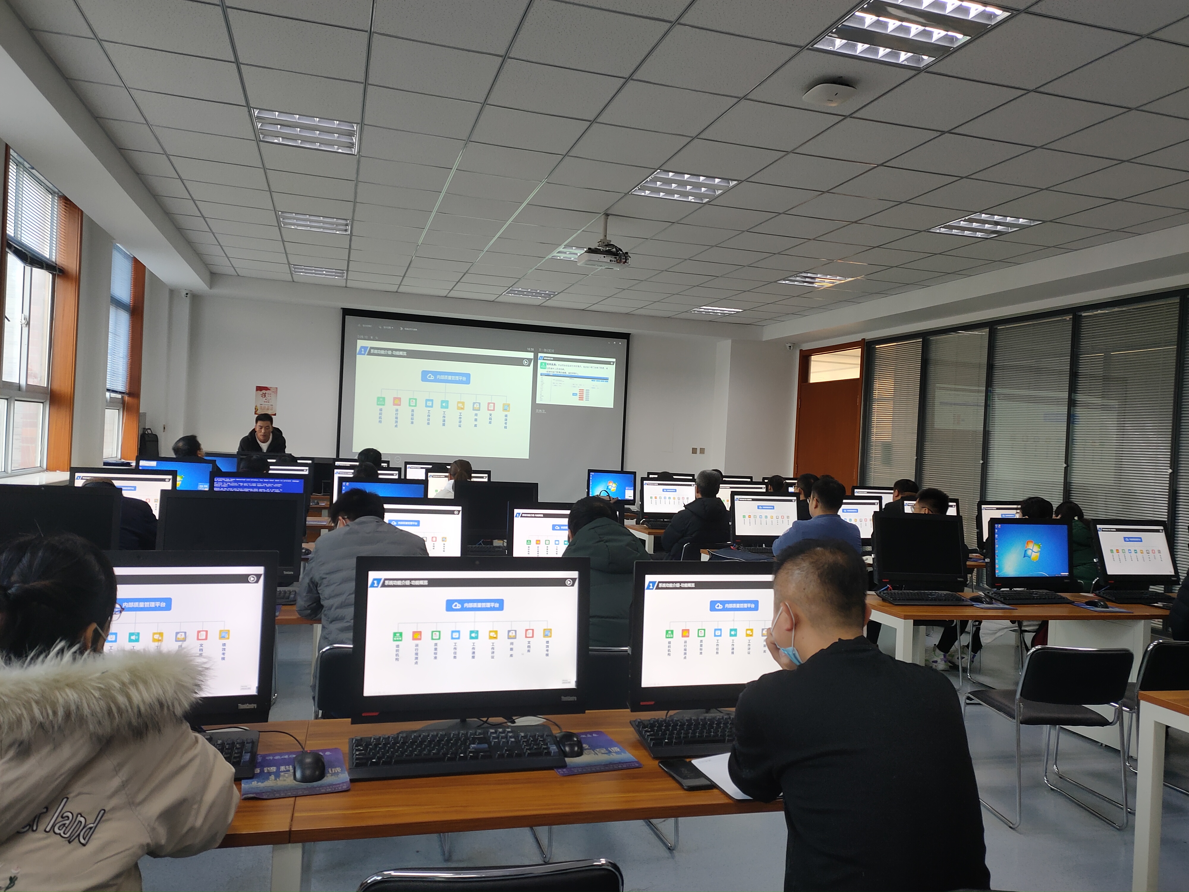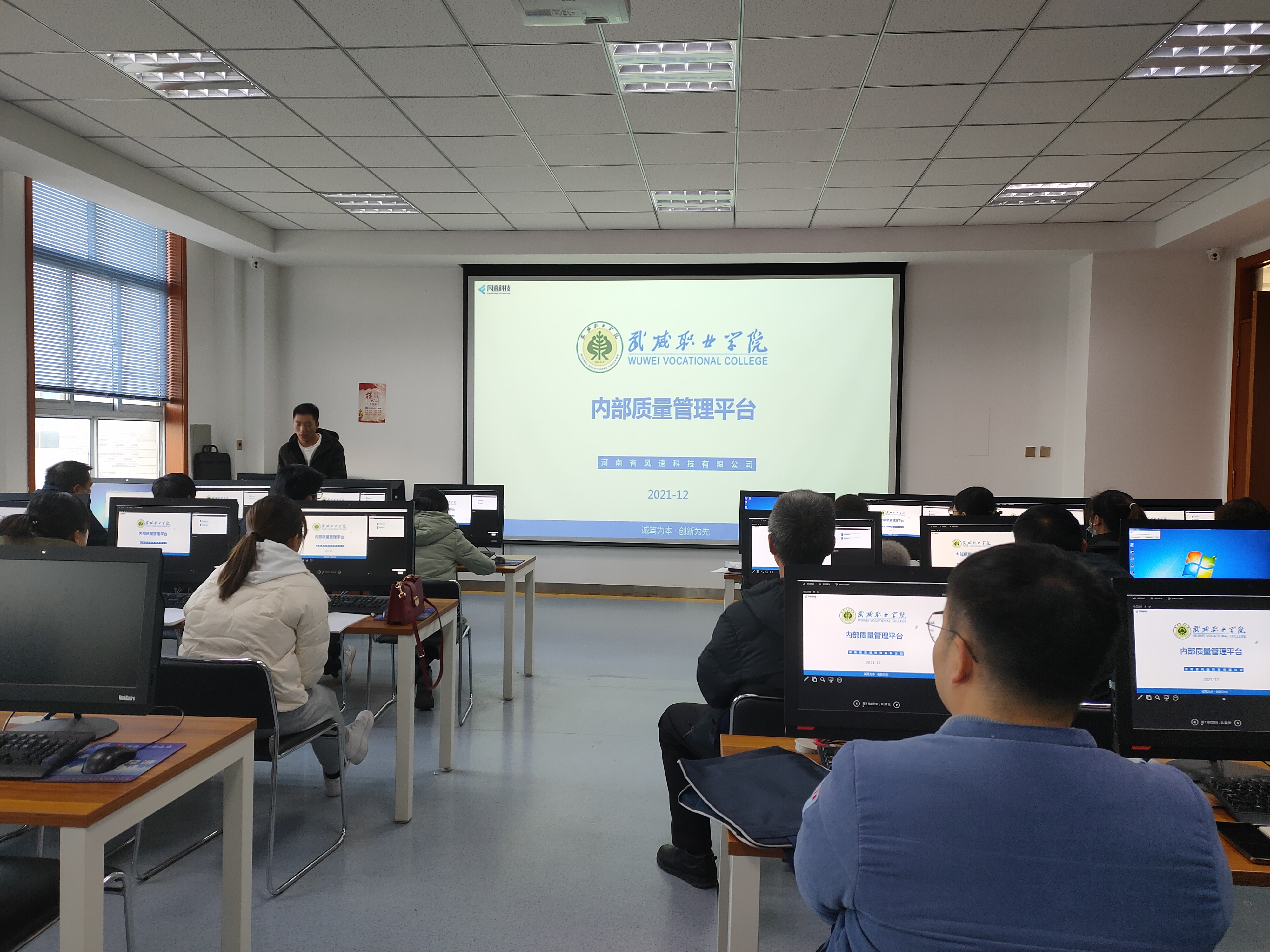 風(fēng)速科技有限公司項(xiàng)目經(jīng)理徐來(lái)彬?qū)?huì)教師進(jìn)行了培訓(xùn)。重點(diǎn)介紹了內(nèi)部質(zhì)量管理平臺(tái)整體架構(gòu)、主要功能、任務(wù)提取、上傳、轉(zhuǎn)辦,任務(wù)辦理與審核、通報(bào)、文檔庫(kù)上傳與使用、績(jī)效考核等,并進(jìn)行現(xiàn)場(chǎng)操作演示,就參會(huì)教師存在的問題進(jìn)行了溝通交流。