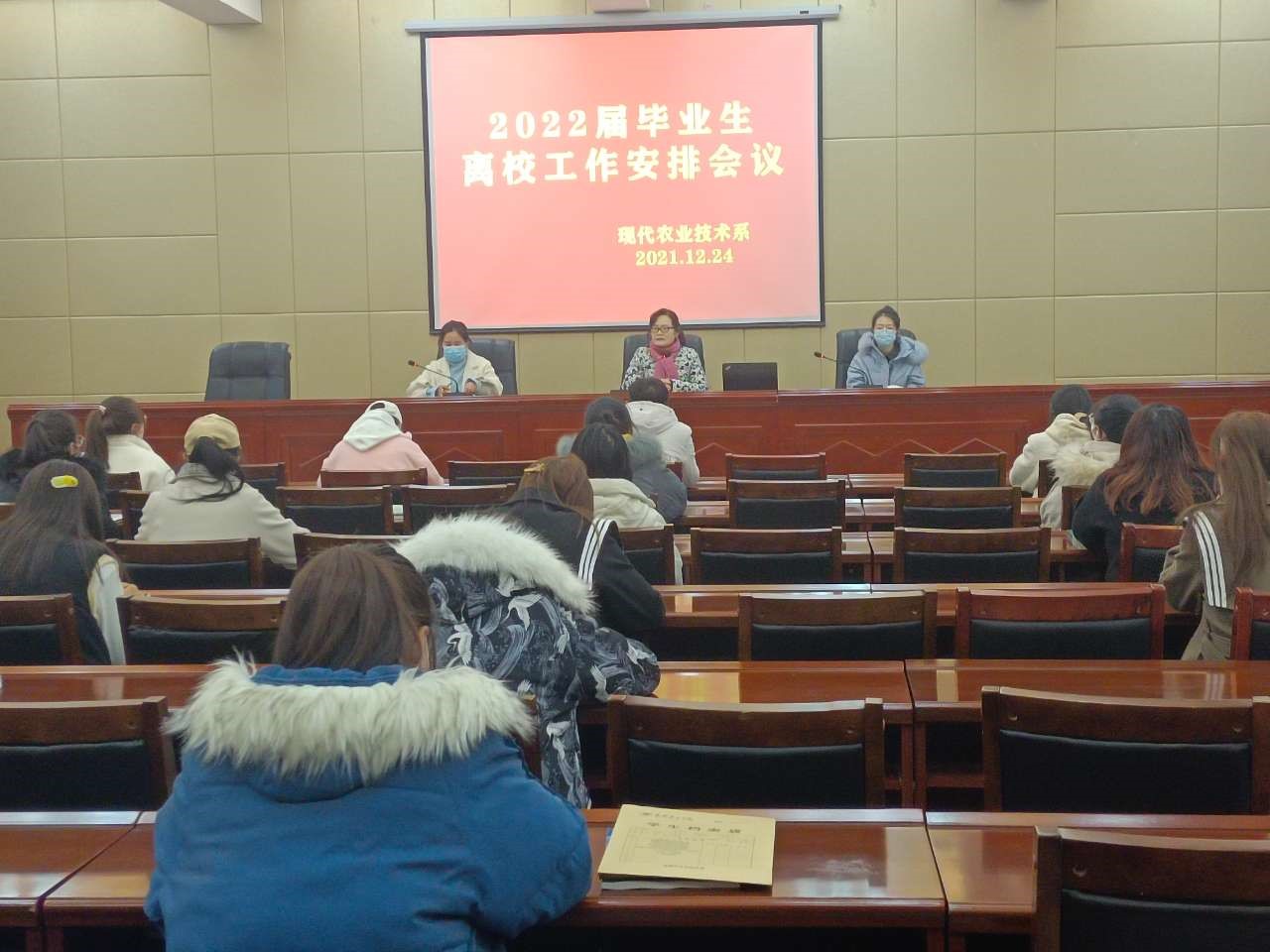 為確保2022屆畢業(yè)生離校工作安全穩(wěn)定、平安有序地進行,12月24日上午,現(xiàn)代農(nóng)業(yè)技術(shù)系黨總支書記晏素珍在行樹樓北側(cè)報告廳組織召開2022屆畢業(yè)生離校工作安排會議,畢業(yè)班班主任和全體畢業(yè)生參加了會議。