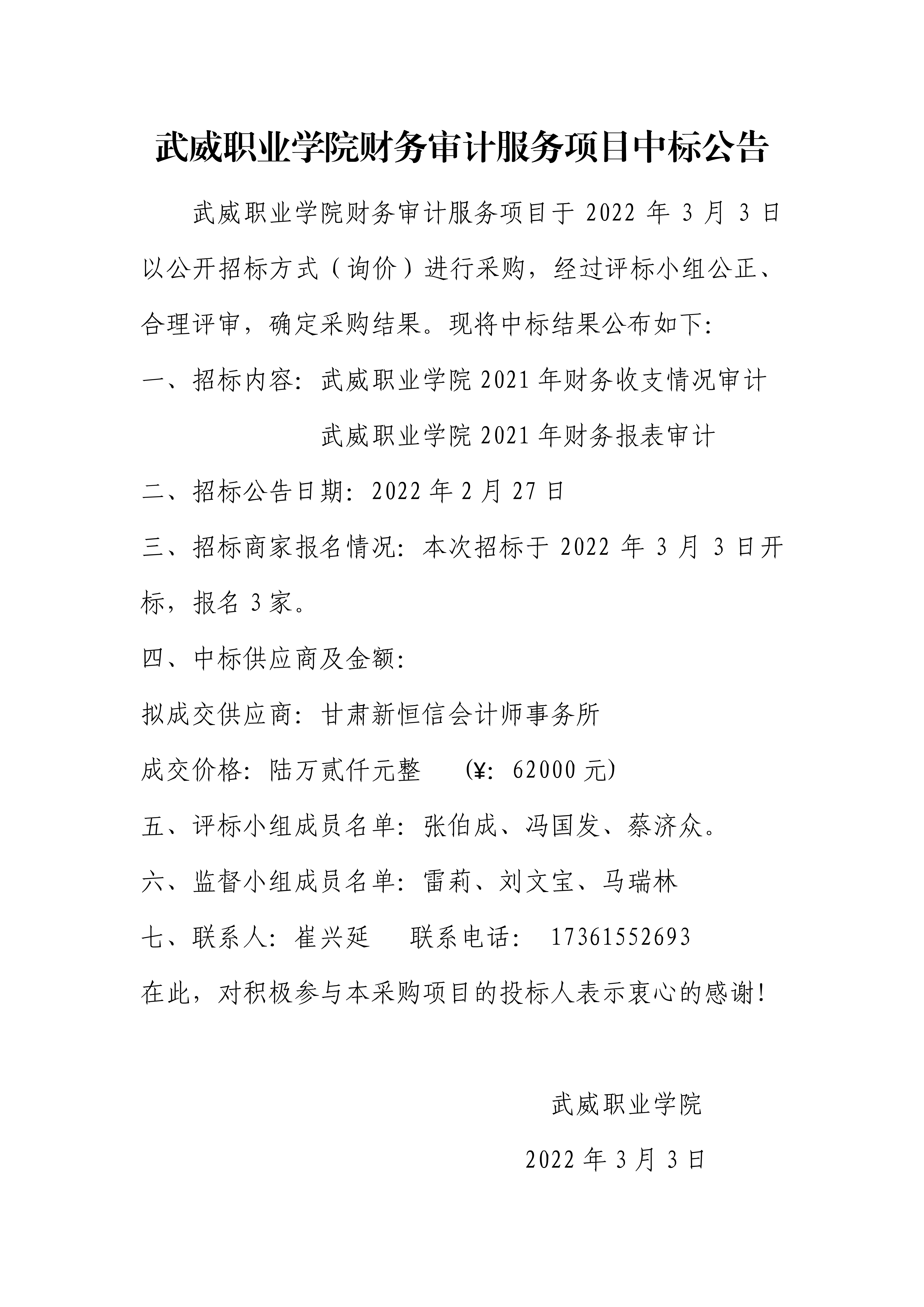 武威職業(yè)學(xué)院財(cái)務(wù)審計(jì)服務(wù)項(xiàng)目中標(biāo)公告