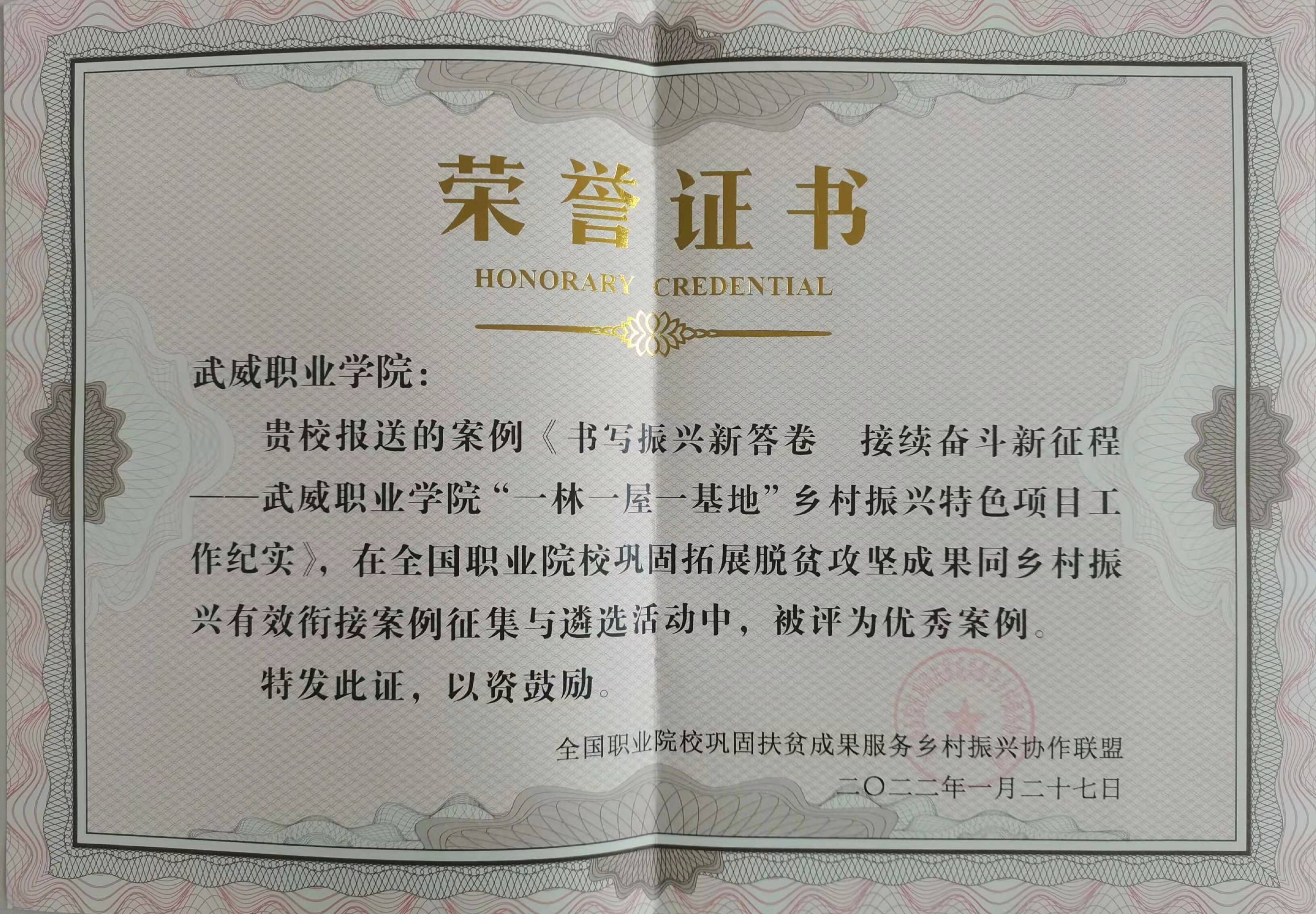 近日,學院鄉(xiāng)村振興成果《書寫振興新答卷 接續(xù)奮斗新征程——武威職業(yè)學院“一林一屋一基地”鄉(xiāng)村振興特色項目工作紀實》被全國職業(yè)院校鞏固扶貧成果服務鄉(xiāng)村振興協(xié)作聯(lián)盟評為優(yōu)秀案例。