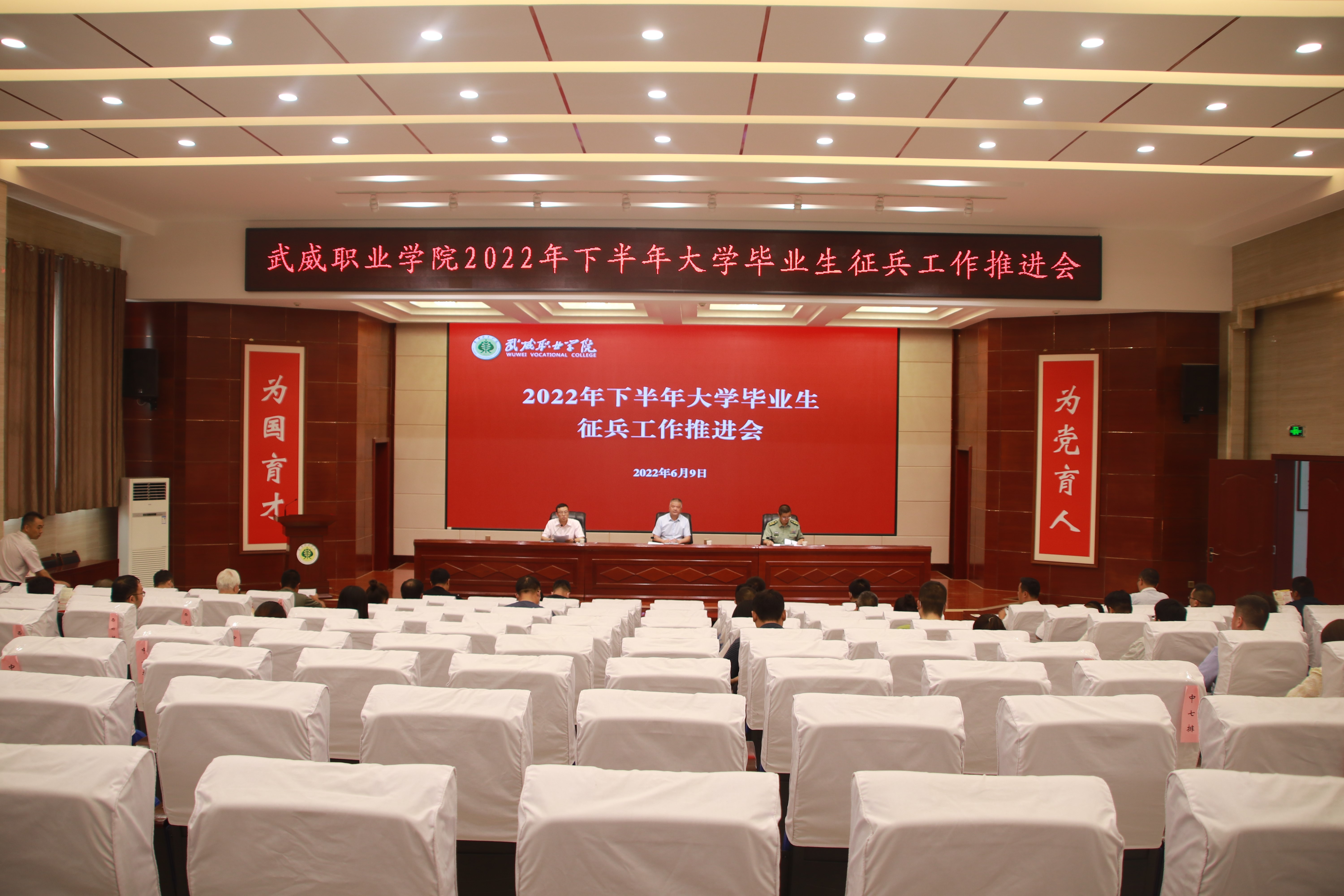 6月9日下午,學校2022年下半年大學畢業(yè)生征兵工作推進會在菁英廳召開,學校黨委委員、副校長王守云,涼州區(qū)人武部中校副部長何志強出席會議。