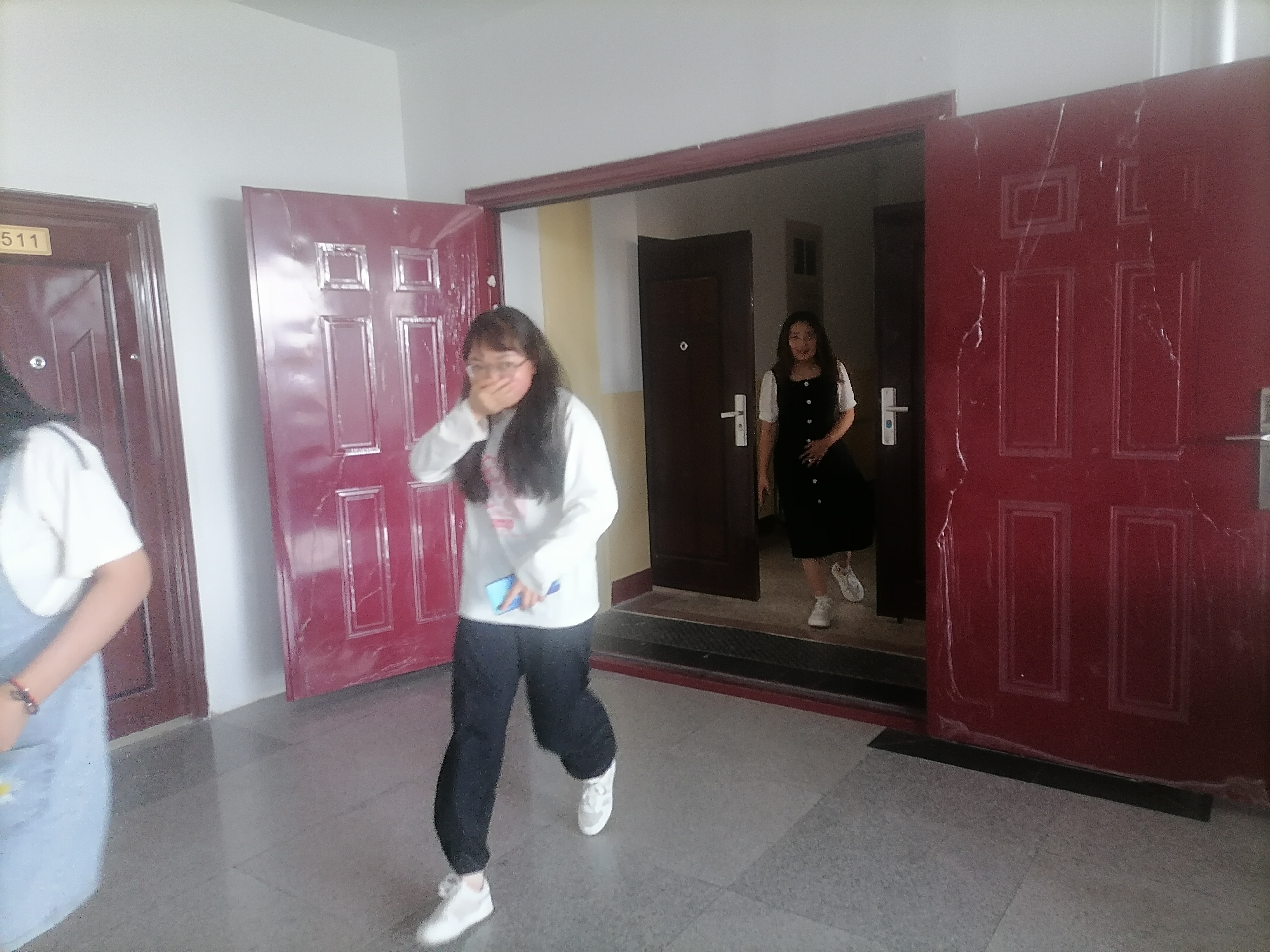 ? ?下午16:50隨著警報的響起,煙霧彈的點燃,上課老師組織學(xué)生疏散,各班學(xué)生在老師們的指揮下,按照指定路線,貓著腰,用手、袖口捂著嘴鼻迅速有序地進行緊急疏散,全體師生撤離到安全地帶。為保證所有同學(xué)安全撤離,學(xué)生會成員迅速清點了各班級人數(shù),并像楊老師匯報。