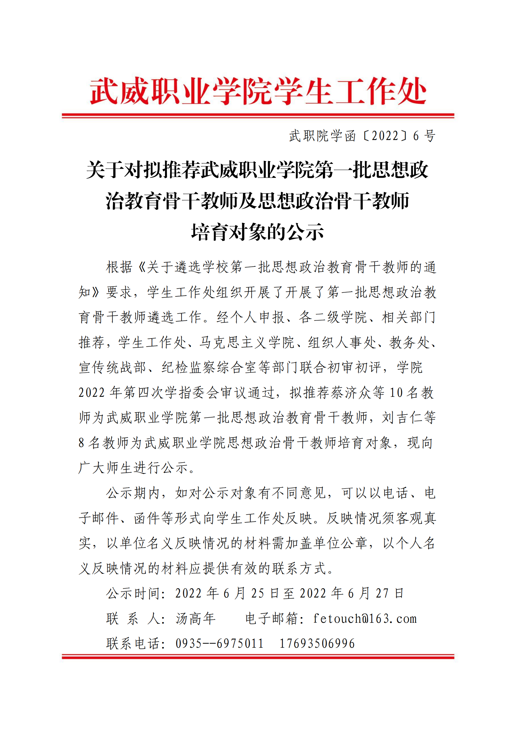 關(guān)于對(duì)擬推薦武威職業(yè)學(xué)院第一批思想政治教育骨干教師及思想政治骨干教師培育對(duì)象的公示