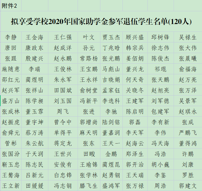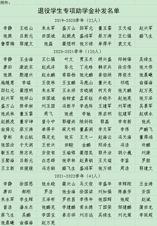 ???? 根據(jù)《甘肅省財政廳 甘肅省教育廳關于下達 2021年學生資助補助經(jīng)費(第二批)的通知》(甘財教〔2021〕68號)和《甘肅省學生資助資金管理辦法》(甘財教〔2022〕20號)文件要求,學生工作處擬對2019—2020學年符合資助條件的23名退役學生每人補發(fā)助學金3300元,共計75900元;對2020—2021學年符合資助條件的120名退役學生每人補發(fā)助學金3300元,共計396000元;對2021—2022學年符合資助條件的43名退役學生每人補發(fā)助學金3300元,共計141900元?,F(xiàn)向廣大師生進行公示。