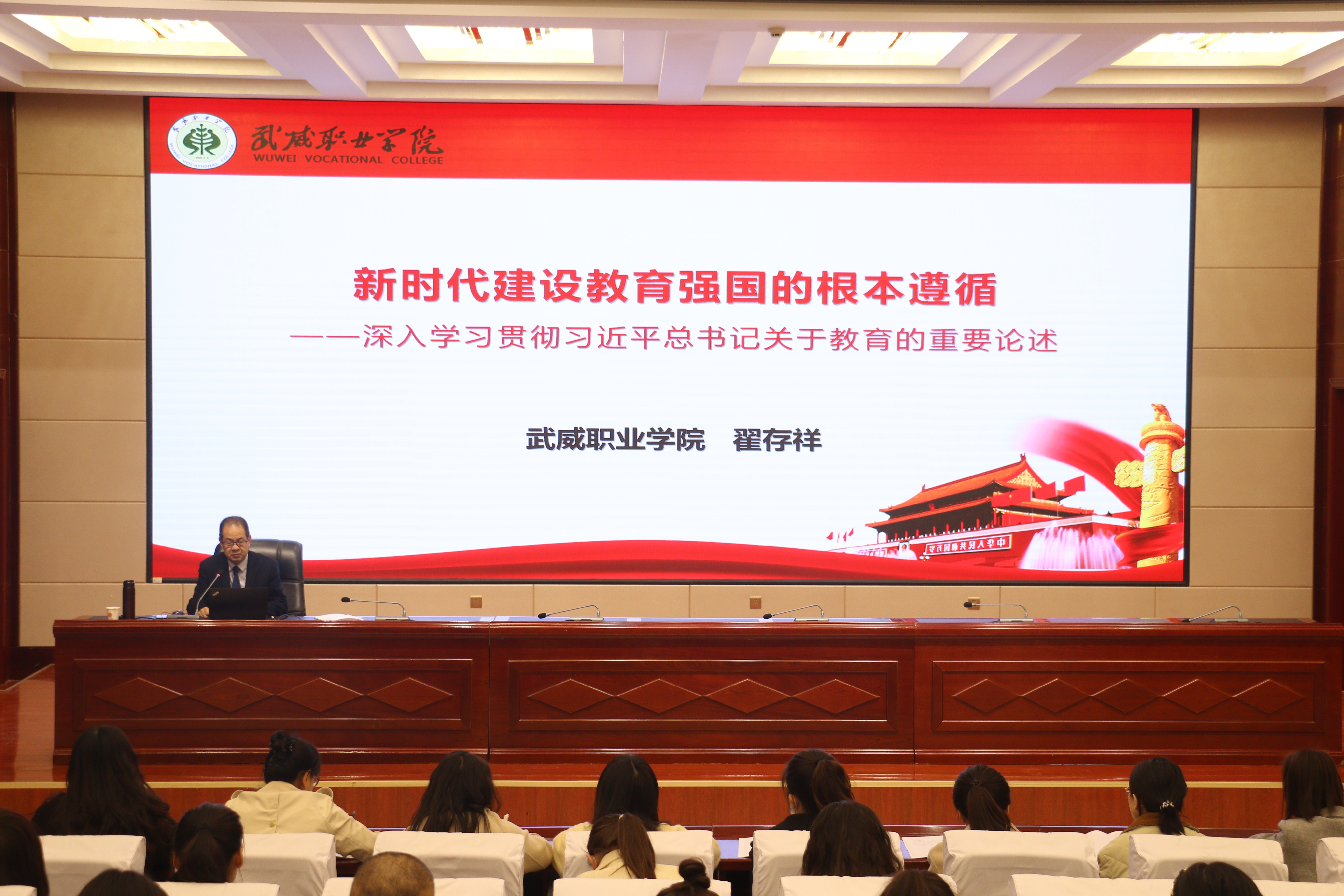 翟存祥代表全體師生對113名新教師成為武威職業(yè)學(xué)院大家庭的一員表示熱烈歡迎,并介紹了舉辦此次培訓(xùn)班的目的。他指出,百年大計(jì),教育為本;教育大計(jì),教師為本;教師大計(jì),師德為本。作為新時代的教師,不要辜負(fù)習(xí)近平總書記“奮斗創(chuàng)造奇跡、力量源于團(tuán)結(jié)、希望寄予青年”的殷切希望。同時,他要求新教師要搞清楚“我是誰,從哪里來,到哪里去”;搞清楚我要“干什么、如何干、為誰干”。盡快站穩(wěn)三尺講臺,盡快融入職業(yè)教育,盡快融入這個大家庭,盡快成長為一名合格的、優(yōu)秀的人民教師,在教育教學(xué)崗位上立德立功立言。