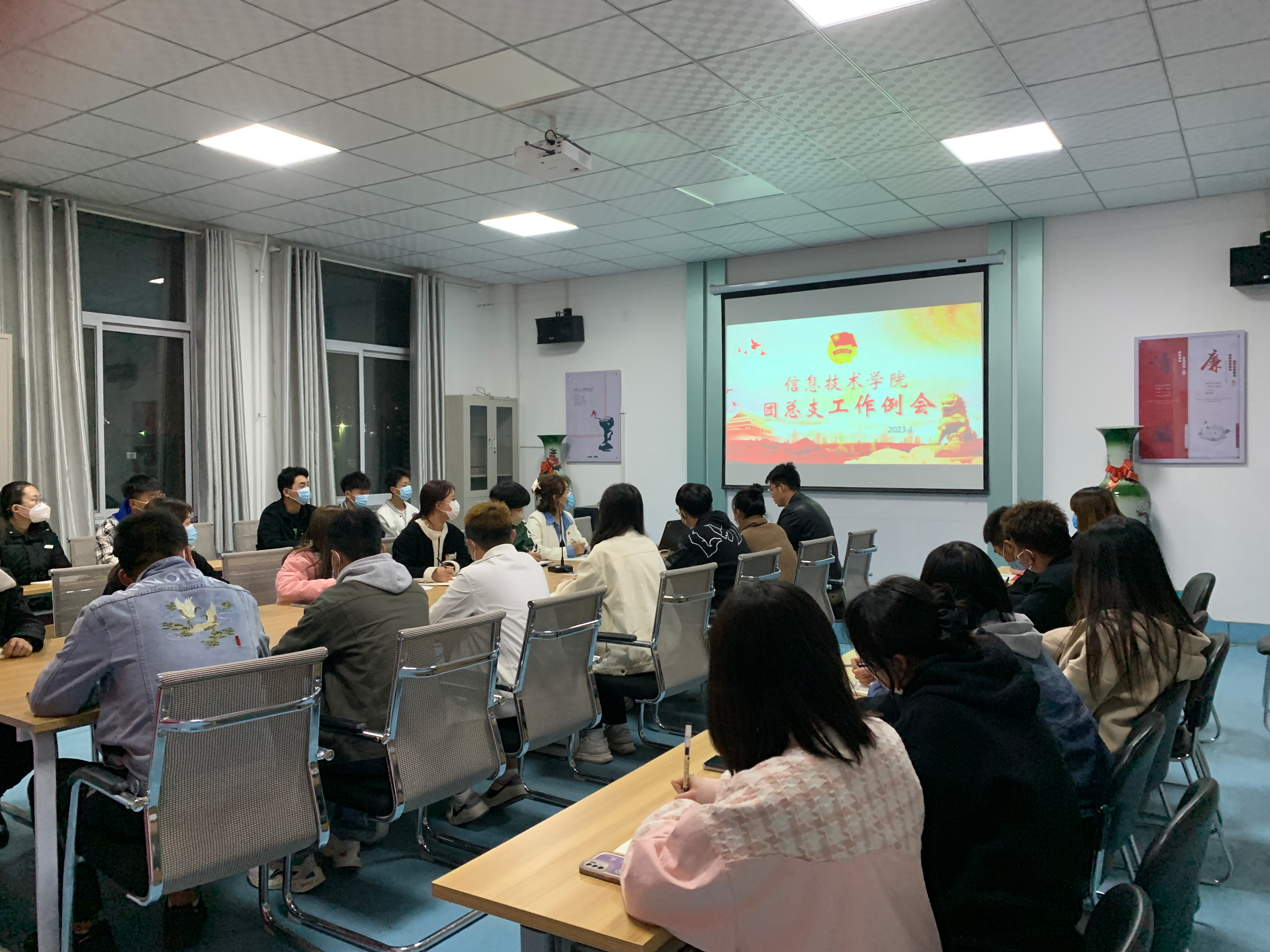 2023年4月9日晚自習,信息技術(shù)學院團委工作會議在明德樓409會議室召開。校團委全體干部、各班團支部書記參加了會議。會議由書記李京靜主持。